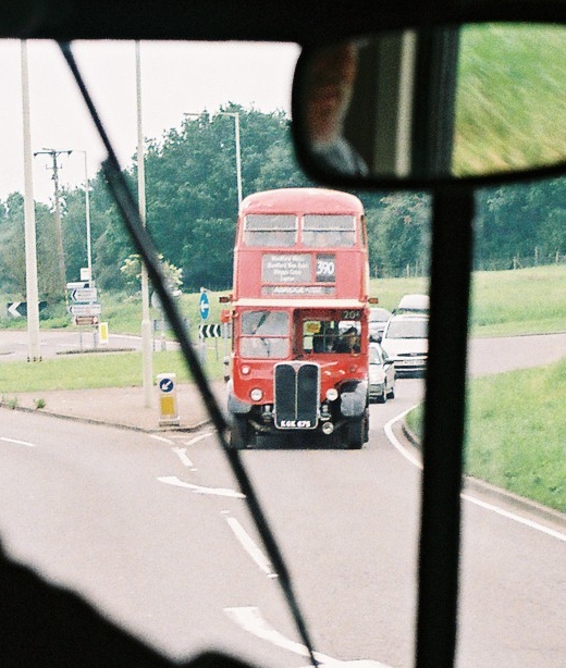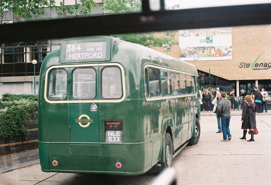 We reboarded and continued our drive down into Hertford. Cravens RT1499 hammered westwards as we skirted round the town, but a four by four put itself inconveniently in the way as I tried to grab a picture. I do lose some! But as we twisted round the chicanery into the bus station we met glass-house RF4, employed during the day on tours. Into the bus station, with just a minute to spare before I was due out again. There was RT113, proudly sporting its rear roofbox and nicely rounded bottom. (If you don't know what I mean, compare the bottom rear corner with a post-war RT.)