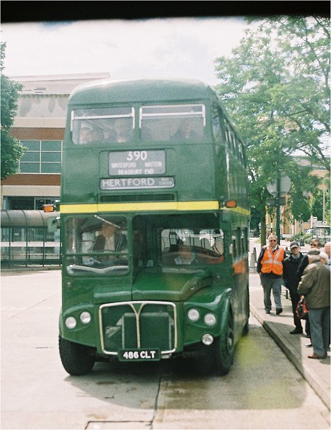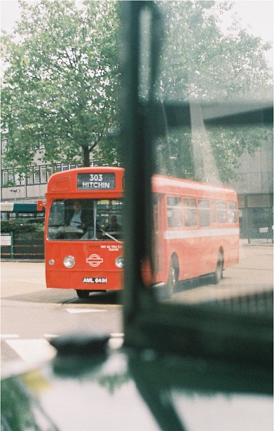 The destination blinds were wound round on RT3228 to give the Welwyn Garden City setting, and we were away again, round through the town and back along the main road towards Stevenage. Passing Little Wymondeley on the by-pass, just before the bridge carrying the 386 route overhead, we met RT3254 pounding towards Hitchin with the 716.