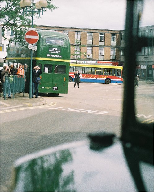 The double-deckers were operating along the main road to Hitchin, rather than through Little Wymondeley, so we were soon to Hitchin, rolling down to St.Mary's Square to pull up behind red RF366. Jim and his crew had had a busy morning, operating from Potters Bar as a 350 to Hertford, then along the long 329/329A routes via Knebworth to Hitchin. Now they were taking a short break before working the 383 to Weston.