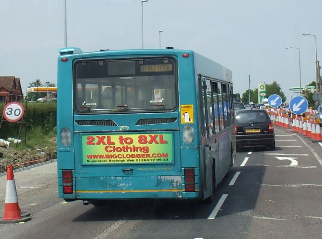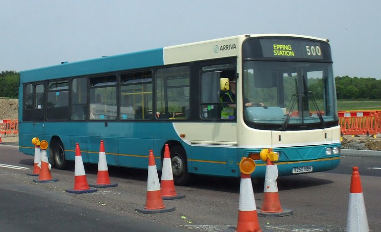 Then we headed for Hertford: through the Dartford Tunnel and up the M25 and M11 to the Chelmsford-Harlow road. No buses so far, not surprisingly. But on the A414 we met a pair at the roadworks outside Harlow: Arriva's Volvo B6BLE/Wright Crusader 3250 was heading for Epping on the 500, and Dart SLF/Wright Pulsar 3417 was heading in towards Harlow.