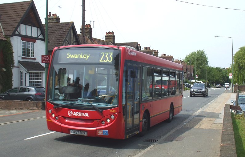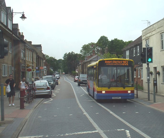 We continued through St.Margarets, passing Centrebus 513, a Marshall-bodied Dart SLF still in Trustybus Colours and working the 351 to Bishops Stortford. We turned north at Amwell Cross Roads (now a roundabout) and went past Ware, running alongside the New River. We continued on up the valley to Hertford, passing Uno's Dart SLF 101 on the 341.