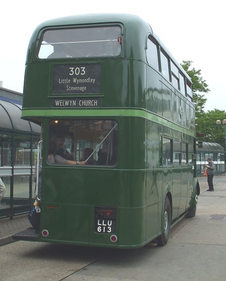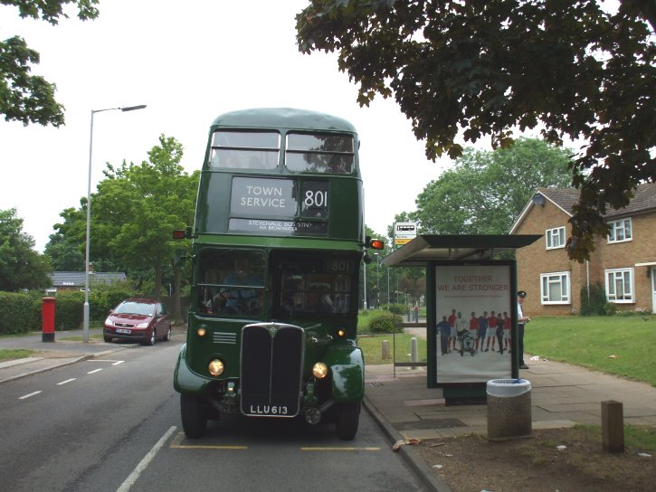 Then we boarded again, and headed back north - up over Mardley Hill and down into Knebworth along the Great North Road, and on northwards into Stevenage. The crew were just commenting that they had been running for about three hours without seeing another LT bus when we passed a red RF, probably RF503, motoring south on the 390 to Hertford.