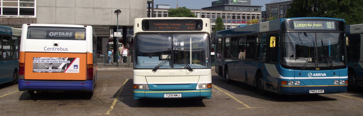 Stevenage Bus Station at five o'clock on a Saturday was full of bustle, with returning shoppers' services. The central bus stance was full. Typical were Centrebus Solo 389, Arriva Dart SLF 3219 and Arriva's Volvo/Wright 3322 on the 101 to Luton.