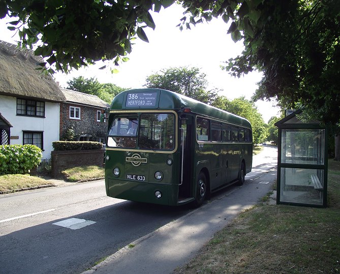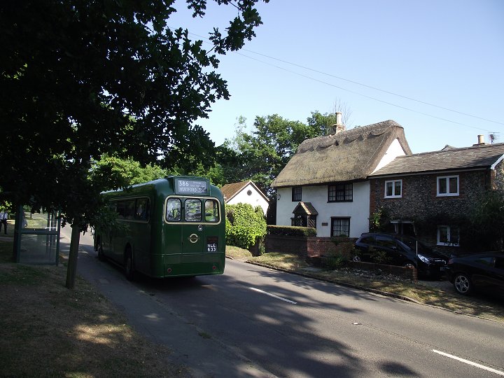 At Walkern our route diverged from the 384, turning left instead of right. A couple of miles north, at Cromer End, we turned off the relatively wide B1037 onto the narrow lane to Ardeley. We stopped at the bus stop before the corner, opposite the red phone box and the massive thatched roof (The Rabbit's Foot pub?). I suggested that photographers went round the corner and reboarded after the bus had made the tight turn.