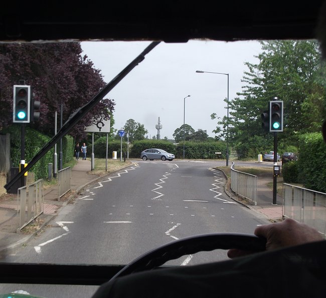 We reboarded, and continued down the lane, at the bottom passing a police car that was waiting for us to pass. We headed back west to Bengeo, and turned in to New Road, and then Parker Avenue, where we pulled up where the stop used to be, (Nowadays the buses do an anticlockwise loop through the estate, stopping in Parker Avenue on the way up.) The bus aroused considerable interest among the local people. After a few minutes we were on our way again, down to the foot of the avenue for a reverse turn, and back up onto New Road.