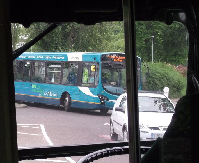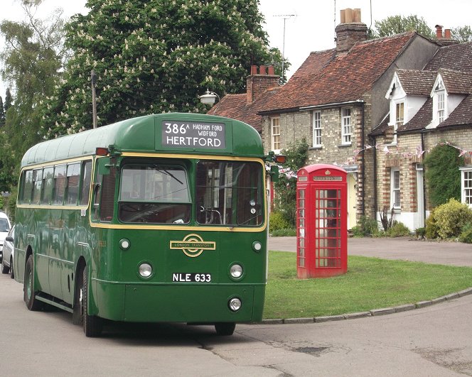 The return journey, on the 386A, started off straight down the main road, all the way to Puckeridge. But there instead of continuing down the Roman Road to Ware, the bus turned off to head for Standon Station. Nothing unusual there. But then it turned left, over the site of the level crossing and the River Stort, and turned right up into Standon Village, stopping at the bus stop by the Post Office. Picturesque. Even a red phone box and a flowering horse chestnut. THe arrival of the RF sparked much interest, and a family asked if they could have a lift home - a few hundred metres along Hadham Road. They climbed aboard, and enjoyed the ride up the lane. Fortunately there was a lack of parked cars today (unlike on Google Streetview). We dropped them off at Treetops. Some of us took the opportunity to walk on up the lane, to watch the RF come round the bend. We continued up the lane, avoiding the fork right into Bromley Lane, to reach Wellpond Green. We called at the Nags Head (now the Kick & Dicky). It appears to still have a 386 bus service. Then it was on, still eastwards, to reach the main road from Bishops Stortford at Hadham Ford. There we turned south, to run down to Much Hadham, where we paused again at the Old Red Lion. Then it was off to Hertford: down the main road to Widford, where we forked right for Wareside and then Ware. We wiggled round past Ware, and back along the main road into Hertford, to reach our terminus at London Road. We pulled up behind RW3... Photos by Ian Smith. Click on any of them for a larger picture.