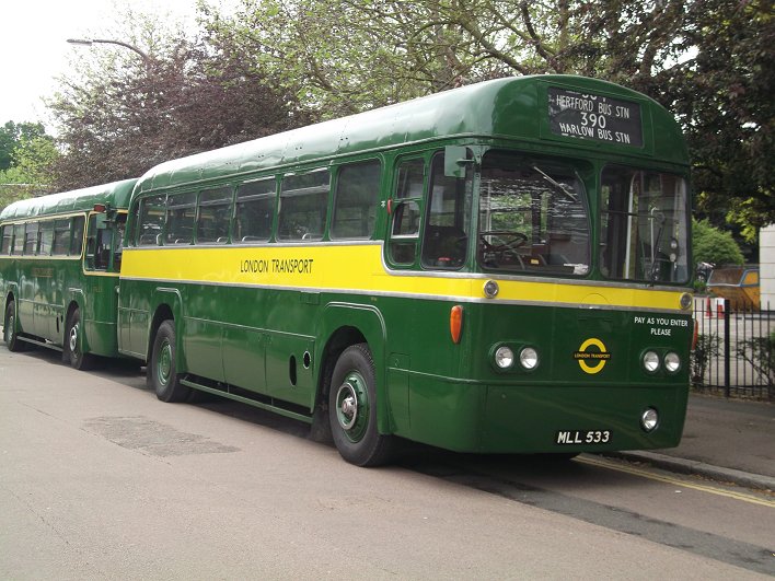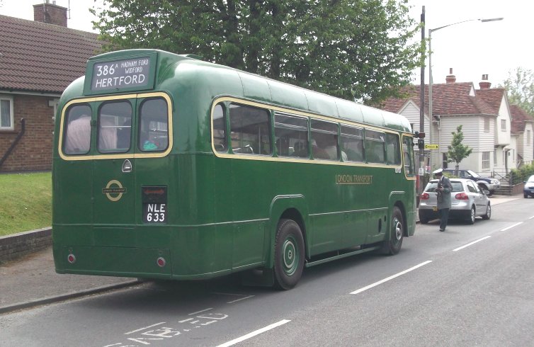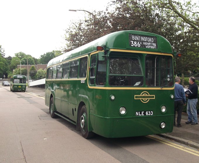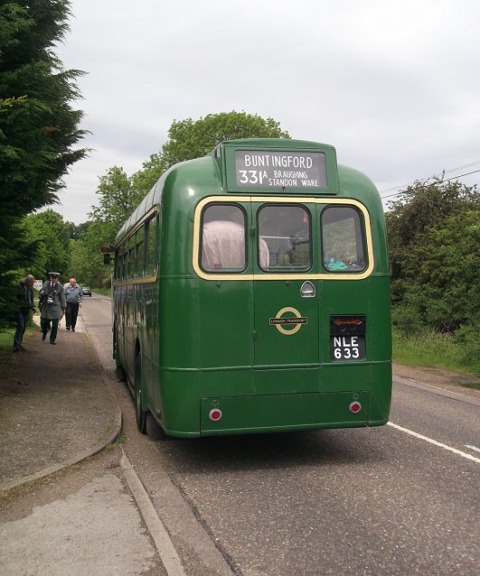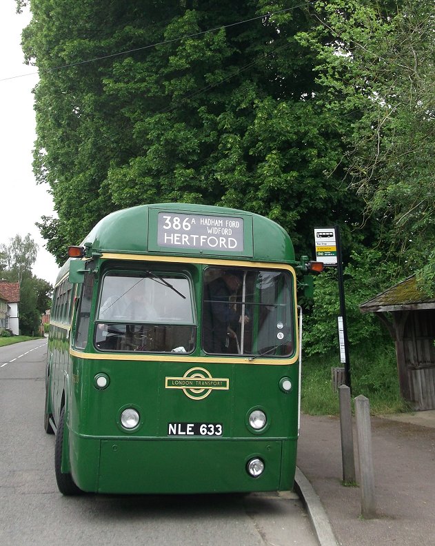 Hertford Running DaysSaturday 2nd, Sunday 3rd June 2012Prepared by Ian Smith, 6th June 2012.Route Recreation331A: Hertford to Buntingford: RF633RF146, restored as a "modernised" GreenLine RF, since demoted to bus duties and given the Canary Yellow waist band with London Transport fleetnames, was the first RF to arrive. However, it was not the bus fior the Route Recreation, and soon departed for the group's bed& breakfast location.It was followed in by the first bus of the afternoon, RF633, restored into fairly early condition as a conductor-worked Country bus (except for the OMO-style drivers door/window, which has been retained). The blinds on the RF were changed, from the 386 to Great Wymondeley that it had worn on arrival, to today's route, the 386A from Hertford to Buntingford. The participants gathered, and club membership cards were issued, as well as programmes for the afternoon. RF281, another "modernised" Green Liner, pulled up behind in London Road. The programme for the afternoon was explained, and some information about the 386A, 331A routes, which were routes from Hertford garage to and from the 386 at Buntingford. The 386A was the longer, more roundabout route via Much Hadham, while the 331A was the more direct route. We were to use the 331A out to Buntingford, and the 386A back. We set off, round the roundabout and eastwards towards Ware. Other buses passed: Centrebus Solo 365 passed by on the 341 to Hatfield via Essendon, shortly followd by sister 322 on the 333 to Molewood via Bengeo. We passed Fairfax Road, erstwhile home of Hertford Garage, and then the old Police headquarters. There we passed Arriva The Shires' 3876 heading into Hertford on the 310. Going on, we ran alongside the New River, part of London's water supply. Parallel to this ran the railway line, with a train bound for Liverpool Street running in off the double-track section from Hertford onto the single line over Ware Crossing and through the station. We turned over the crossing behind the train, following an Arriva Solo - probably 2486 on the 395. We wound our way through Ware, and headed north for Wade's Mill, up the old A10 Roman Road. We met the current A10 near the turn for Standon, crossed it by roundabout, and headed up through Puckeridge. At the top we wiggled round the modern layout onto the road continuing north past Braughing Station. Just by the old station the crew found a safe place to stop, lose the tail of traffic, and let us all take a few pictures. The roads were remarkably quiet: perhaps everyone was in London or glued to the television. We continued north through Dassels to Hare Street, and turned west along the road to Buntingford. Another pull-in by a farm entrance on Hare Street Road provided a further photo opportunity. Now it was not far to Buntingford. We dropped down towards the village, and pulled up at an actual bus stop at the terminus - The Jolly Sailors. The blinds were changed ready for the return journey.