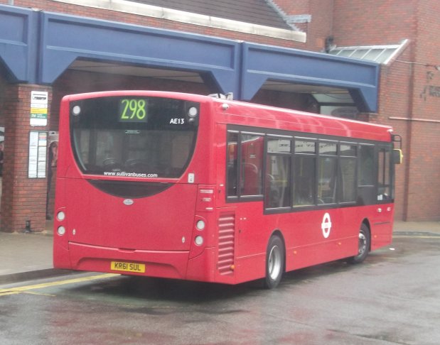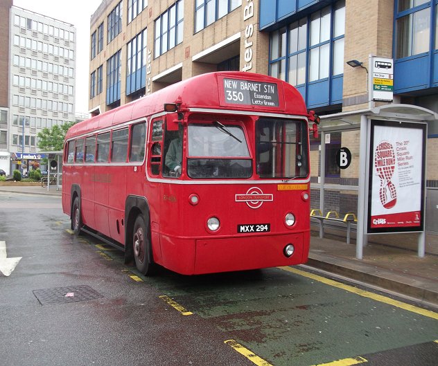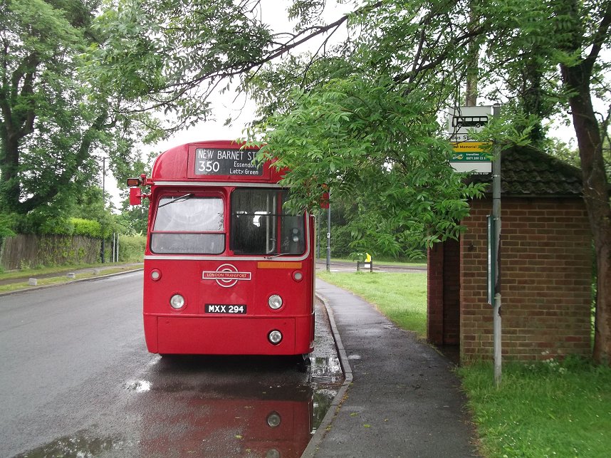 350: Hertford to New Barnet Stn: RF406The other bus in the bus station was RF406. This had arrived from Bishop's Stortford on the 350, and was continuing through to New Barnet Station. This route was one of my objectives for the day - it was a pity that I hadn't known to catch it at Bishops Stortford! I was welcomed aboard, and we were soon away, turning immediately to travel through the heart of Hertford town. It was good to come this way for a change. We were soon out of town, heading through pouring rain, under the tall railway viaduct, then left on the old road to Hertingfordbury. We continued along the old road, and pulled up at the bus stop at Birch Green for a photo stop.It was a goog place for a photo-stop: quiet road, bus stop, shelter, a nice tree...rain.. We went on again, turning left at Cole Green, and dipping under the old railway to reach Letty Green, where we had another brief photo-stop. We went on south to the Essendon Road, where we turned sharp right to head alongside the River Lea for a while, before turning up the hill to climb through Essendon. We continued in the pouring rain past the expensive Hertfordshire mansions that dot this countryside, to join the old Great North Road at Brookman's Park. We turned off before reaching Potters Bar garage, to head for the station. The entire road-side approaching the station was blocked by parked cars, so we pulled in at the bus station. We were still running early, so there was time for more photos, not only of RF406, but of Arriva's EnviroDart ENX2 on the 313 to Chingford, and Sullivan Buses' EnviroDart AE15 on the 298. We went on, turning right out of the bus station to duck under the infamous railway bridge, turned left and climbed up to recross the East Coast Main Line, and turned south down the old Great North Road towards Hadley Highstone. We had another pause before dipping into the maelstrom of Barnet, at Hadley Green. Then it was on down the hill, past Barnet Church and High Barnet tube station (end of the Northern Line), then under the tube line and forking left into station road to take us to New Barnet Station (on the ECML).