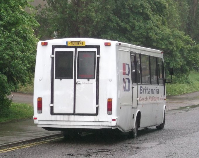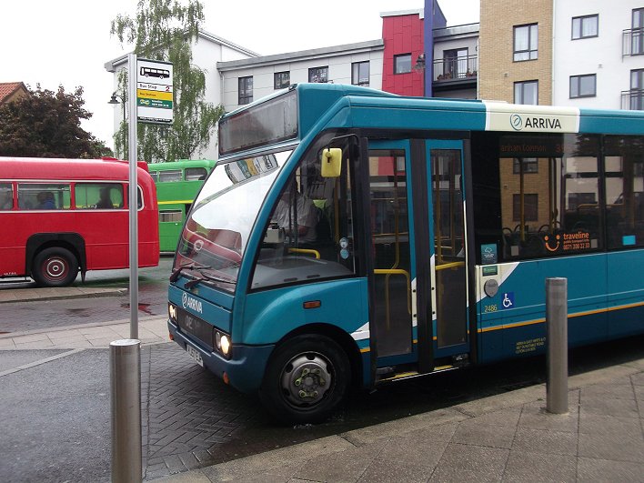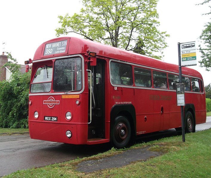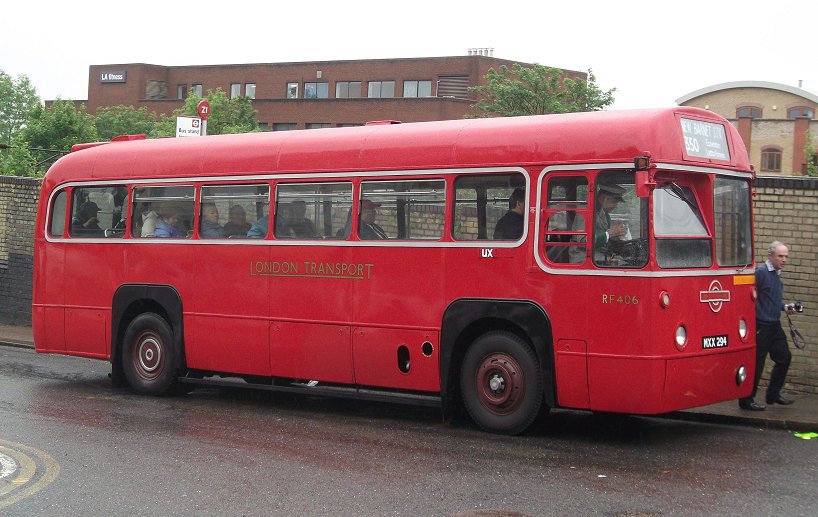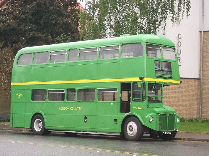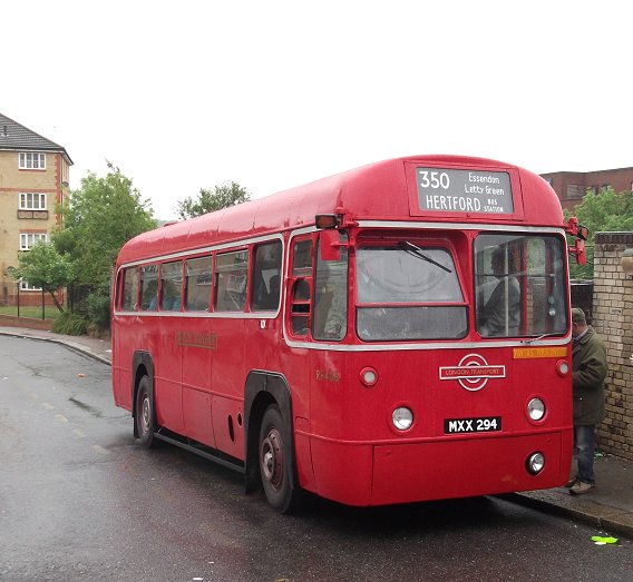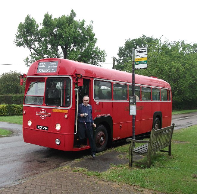 Hertford Running DaysSaturday 2nd, Sunday 3rd June 2012Prepared by Ian Smith, 8th June 2012.Sunday MorningGetting thereI had intended to catch RF4 southwards from Letchworth Station. Then the internet suggested that my train from Cambridge to Letchworth would be substituted by a bus due to engineering work, so I expected to have to go via Broxbourne to Hertford East. But on the platform at Cambridge I was told that the engineering work was finished, and I could travel to Letchworth by train, arriving at seven minutes to nine. So I joined the train. We sat outside Royston Station for a quarter-hour, waiting for the end of the engineering possession. So it was well gone nine when we reached Letchworth. RF4 would have gone. So I stayed on the train to Stevenage, where I headed for the expected railway substitution bus. It had gone, not waiting for the late-running connection. Now what I should have done was dash back over the bridge to the bus station, to catch RF4. But I forgot I would have time to do that. When I DID remember, it was just in time to watch RF4 sail past on the other side of the railway. So I waited in the rain, without even a bus shelter, for the substitute, which turned out to be an elderly Mercedes/Plaxton Beaver of Britannia: TUI1641. (This itself was ex-Capital of West Drayton, and then T-GM, when it was R173 TKU).I headed south on the Beaver, through pouring rain. We called at Watton Station, turning just beyond the station bridge and waiting time at bus-stop. Continuing on, we met RT3254 ponding north through the rain on a 390 to Stevenage. I alighted at Hertford North Station. There I was fortunate in a connection, onto the 395 to Bircherley Green, aboard Arriva Solo 2485. This took me east, through the heart of the town, to the bus station. I looked round: London Country-liveried RML2323 was resting, having its blinds changed. RF633 was there too, ready for a trip on the 308A. Centrebus Dart SLF 541 arrived too, on the Sunday 311 service.