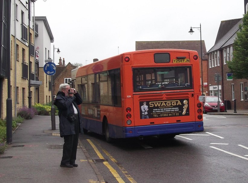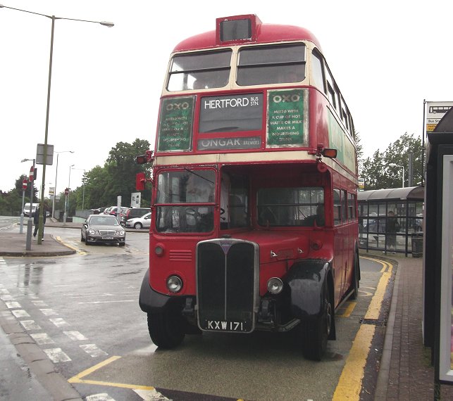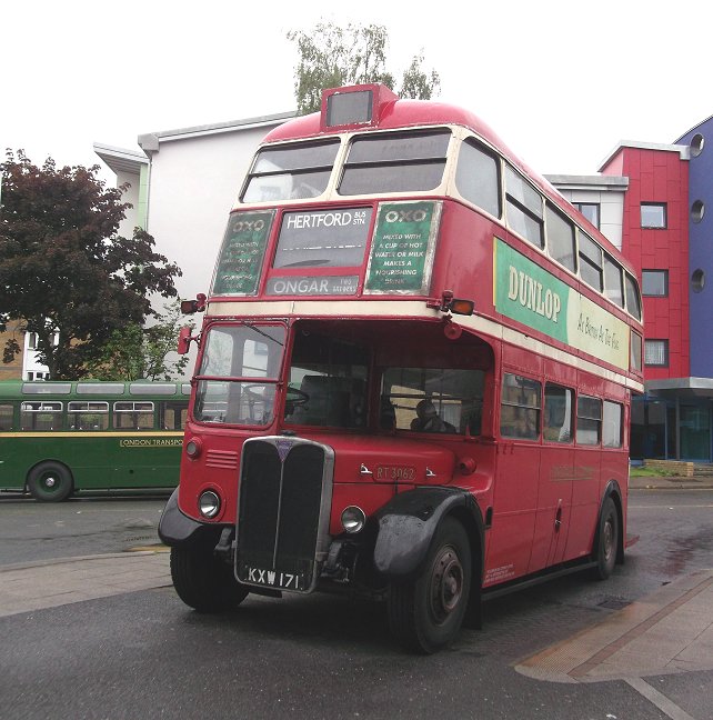 Meanwhile RW3 sat at the other side of the bus station, attracting much admiring attention. Eastbourne Corporation AEC Regent V No69, as hired by London Country (but not here) was in operation too, and arrived on a 331 working from Standon. Hertford to Hatfield and back: RT3062I asked organiser Colin Rivers if there was anything particular that he wanted me to cover. He asked if I would be conductor on RT3062, which driver Paul Brophy had brought in from The London Bus Company. This is something of a favourite of mine, and I readily agreed. Paul and I had a bite of lunch first, before going out.We did not have a full set of blinds. The nearest we could find for a 341 trip was Hertford Bus Station as a destination! As we were not going to be able to use the Essendon Road anyway because the heavy rain was weighing down the trees, it was not going to be much of a 341 trip anyway! (Trees along this road have not a few heavy branches at about fifteen feet above the road. After heavy rain they are about a foot lower.) There were still hardy souls braving the torrential rain when we loaded up for the trip. We set off round the town, and instead of turning left up past the County Offices to Horns Mill we continued along the main A414, under the railway viaduct and straight for Hatfield, swooshing along in the rain. It was not until we reached the roundabout at the junction with Holwell Lane that we rejoined the actual 341 route for the remaining short drive along the dual carriageway to Mill Green. There we turned off up into Hatfield, turning south down the Great North Road to reach Hatfield Station. As we made the complete turn onto the stand outside the station a brand new WheelForward Streetlite of uno made the turn the other way to head off southwards. The resulting photo, grabbed from the rear platform, was sadly out of focus and blurred in the bad light. Sorry! At least for the return trip we had Hertford on the front! (and Special Service on the rear). Ding-ding! We were away again, back along the Great North Road to meet the A414 at Mill Green, where we spiralled down onto the main road for the dash eastwards. And RT3062 does go. Fast and smooth. It seemed no time at all before we were wending our way back round Hertford and back into the bus station. Now we had a short wait before our next trip out, on the 390 to Stevenage. So we took the RT over to the other side of the bus station, and parked in front of RW3. Centrebus Dart SLF528 squeezed past and went off towards Waltham Cross. Paul and I went for a cup of tea.