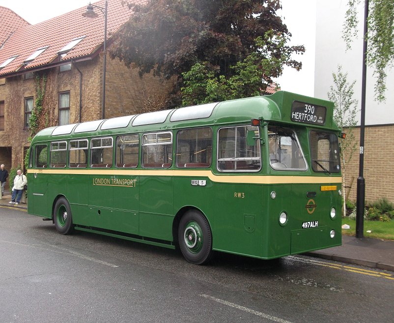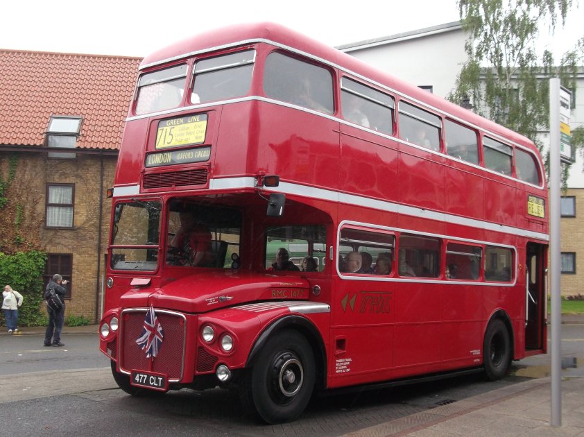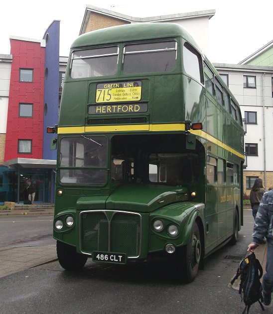 Hertford Running DaysSaturday 2nd, Sunday 3rd June 2012Prepared by Ian Smith, 12th June 2012.Early afternoonBack at Hertford it was busy. GS64 (from the London Transport Museum) was fully loaded for a trip on the 329 to Bulls Green, and departed to allow GS2 onto the stand to unload from a similar trip.A type celebrating fifty years since coming into service was the Routemaster RMC coaches. Two were operating today on the 715 between Hertord and Wormley: RMC1500 and RMC1477. The former, masquerading as RMC1486 as its original registration is still in use elsewhere, had operated up from London, despite the Jubilee celebrations affecting the capital. RMC1477 belongs to Timebus, and we were delighted to see it here. Both worked into the bus station at the same time now.
