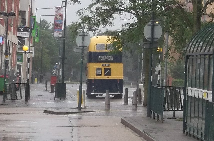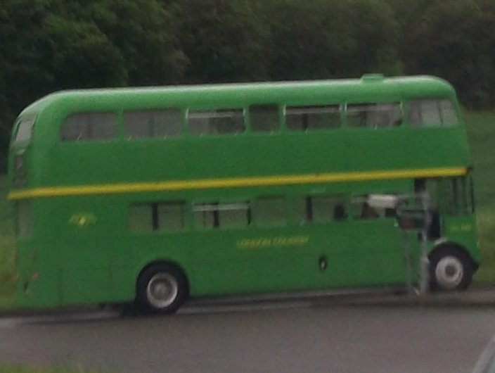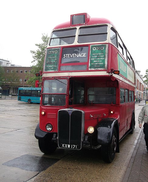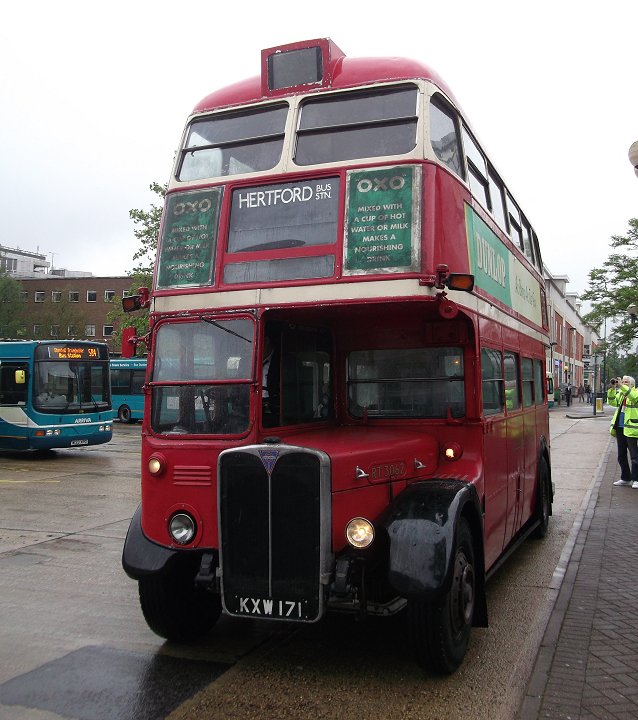 Hertford Running DaysSaturday 2nd, Sunday 3rd June 2012Prepared by Ian Smith, 15th June 2012.Late afternoon: Hertford & Stevenage390: Hertford to Stevenage and back: RT3062Paul and I took RT3062 to Stevenage - with a few passengers as well. After by-passing Hertford Town Centre we went past Hertford North Station and took the Stevenage Road. Tree problems began almost immediately - the first time we have had problems on this trunk route. Fortunately the branches whipping at the front dome were lightweight, but Paul kept the speed low, and where possible kept to the centre of the road.Nor were the problems eased when we turned off into Watton. The trees at the south end of the village were similarly weighed down by the heavy rain. For once we were glad to run up the main road into Stevenage, rather than turning aside into the Broadwater Estate. We passed RT3254 heading the other way as we approached the town. We arrived at an almost deserted Stevenage Bus Station. Very few people were out in the rain. I suspect most were tucked up at home in front of the TV watching the Jubilee programmes and downing a few tinnies or cuppas. There were a few Wright Renowns in the bus station: 3322 and 3306 were resting together on the central stance. One of Arriva's Enviro300 Darts came in on a 301 to Hemel Hempstead. I changed the blinds on the RT, and we were away again, heading back for Hertford. We swished our way south from Stevenage, along the network of concrete highways, and took the main road towards Hertford. After our experience coming north through Watton we stayed on the by-pass, and missed out the village. RML2323, heading north, was just emerging from Watton as we passed the roundabout, resulting in another of those blurred off-the-platform pictures. We went on down through Stapleford and Waterford, watching out for low-hanging trees whether they were on our side of the road or the other. The worst stretch was coming down towards Hertford North. The guy in the RangeRover behind us obviously had too few brain cells to work out why the big red bus kept slowing to walking pace, and became a bit impatient. Fortunately he did not do anything rash. As we wound our way into Bircherley Green Bus Station we passed RMC1500 departing, presumably heading back for London. Next to the Saunders RT in the bus station was Eastbourne 69, which I discovered was going to Stevenage next, and RT3254, which had arrived back from there ahead of us.