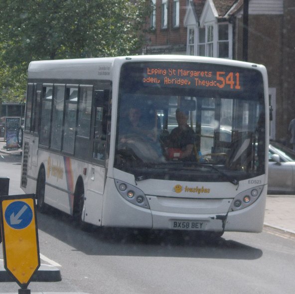372: Hertford to Tylers Cross: RF633RF633 was set up as an Epping bus on the short-lived 372 from Hertford to Coopersale Common.We set off from London Road, round the large roundabout at Hertford East and off towards Ware. Near the old LT garage in Fairfax Road we passed TGM Essex' Citaro 3893 on the 724 bound for Heathrow. We headed on for Ware, which we by-passed alongside the New River, the aqueduct created to take fresh Hertford spring-water into London. Volvo B7RLE / Wright Eclipse Urban 3881 of Arriva The Shires was rolling stock on the Saturday 310 service. We turned east at Amwell Crossroads for St.Margarets, where we crossed the railway (Hertford branch). We passed through the village and turned south. We came to a halt at Roydon Station, where the lights flasshed red and the barriers came down just as we approached. We had a lengthy wait for trains to cross before the barriers lifted again. We paused again at Tylers Cross. Here was one of the connection points on the network, where the Epping - St.Margarets buses met with the Harlow - Broxbourne service - and waited to actually make connections. In latter years, as Harlow New Town developed, the 381 from Epping turned aside here into the fledgeling New Town. 381A: Tylers Cross to Coopersale Street: RF633The blinds on RF633 were changed over to those for the longer-lived 381A to Coopersale Common.We trundled on southwards over the rolling Hertfordshire countryside, through Epping Green and Epping Upland. Epping itself appeared on the horizon. Approaching the town, we did not make the turn into the Beaconsfield Estate, which these days is more clogged up with parked cars than in days of yore. Instead we continued along the the north end of Epping and turned south to stop in the High Street. We paused for photos. Townlink's Dart SLF Y293FJN passed us, heading towards Harlow. We set off again towards Epping Church. We passed Trustybus EnviroDart EDS23 working north on the 541 from Loughton. We turned down towards Epping Station. One of The London Bus Company's Routemasters came toiling up the hill, providing an Epping-Ongar Railway route 339 journey to North Weald and Ongar. A pot-hole spoiled my photo, by bouncing me at the crucial moment. We did not visit the station, as these routes did not, but continued over the railway and down into the valley. We trundled along to The Merry Fiddlers, and turned uphill to Coopersale Street. We paused at the triangular green there (a short-working terminus) and turned the blinds back to 372. 372: Coopersale Street to Coopersale Common: RF633We completed the stiff little climb up into he fringes of Epping Forest at Coopersale Common, and paused opposite The Garnon Bushes.We still had to visit Toot Hill before the return trip..
