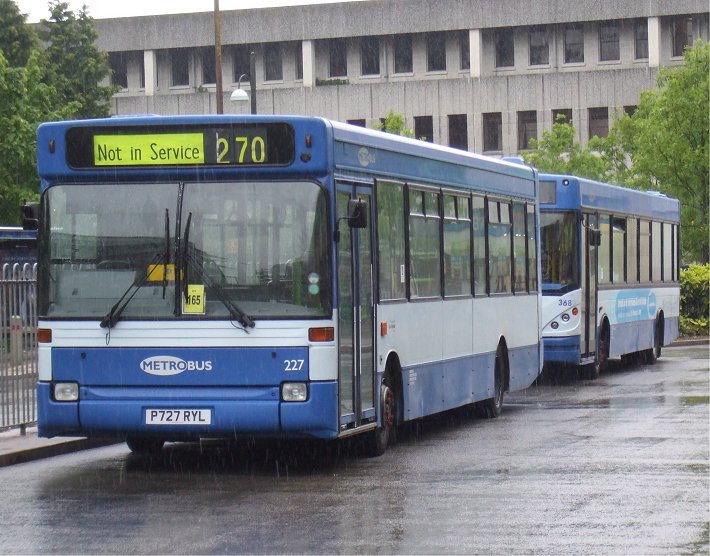 Other buses stood in the bus station, mostly belonging to Metrobus of course, in their two-blues livery. Prominent were a pair of Darts, Plaxton bodied 227 and a later Caetano-bodied bus.