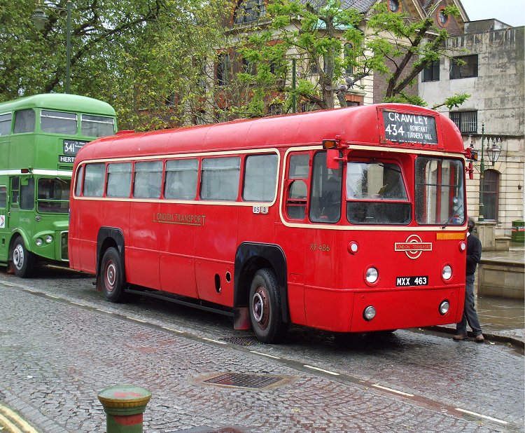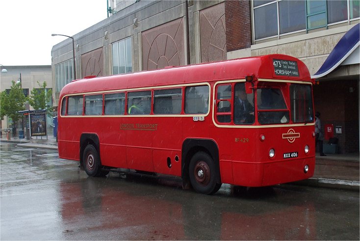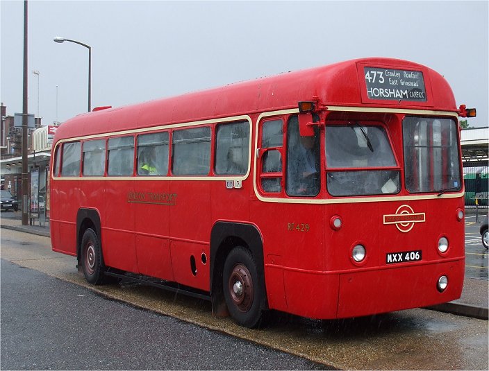 I stood in the rain at Three Bridges Station, waiting for a bus to Horsham. I was not quite sure which would arrive first, the advertised 473 feedeer service or RT3148. It turned out to be red RF429 on the 473, which appeared bang on time under the big railway bridge and pulled up at the station stop.