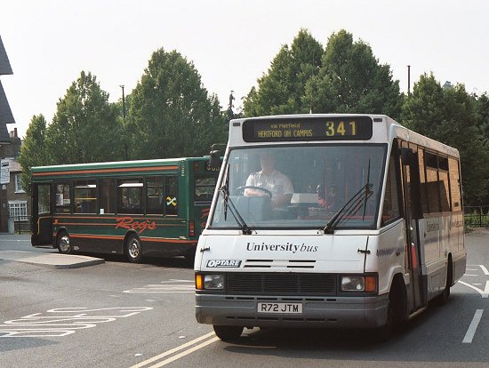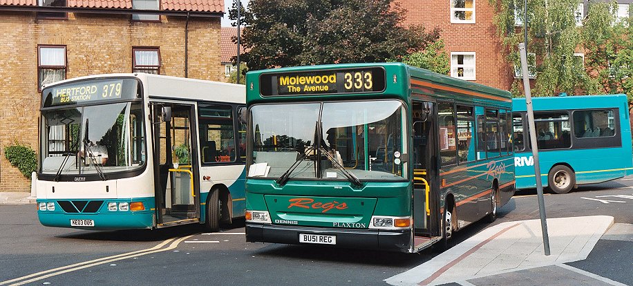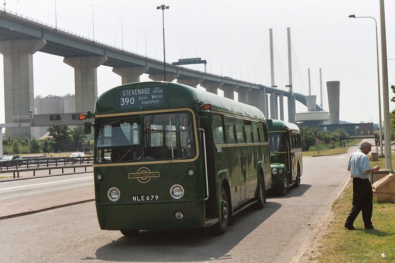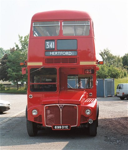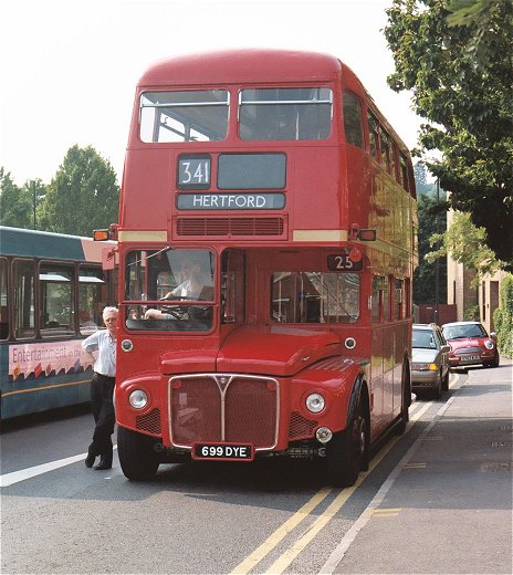 Hitchin Running DaySunday 1st June 2003Prepared by Ian Smith, 16th June 2003Part 1: Saturday (RF679, GS2, RMC1699)This was going to be a Running Day with a difference for me. I was going to spend the whole of the Sunday on a GS - GS2 to be precise, plus part of the Saturday getting up to Hertford. The repainted GS2 was going to Hitchin to celebrate fifty years since it started work - the first of the class to do so - at Hitchin in October 1953.I met up with Colin Rivers, Peter Aves, GS2 and RF679 on Saturday morning, down in the depths of Kent. We were to have a leisurely run up to Hertford, where we would stay overnight, leaving us fresh for an early start on Sunday. Final preparations were made, water, oil and fuel levels checked, the correct sets of blinds fitted to the rollers, then we were off into the Kent sunshine. The two buses kept each other company up to the Dartford Tunnel. I travelled on RF679 to start with. We passed through the tunnel to the Essex side, where we paused to check everything again. (Note: we'll have to produce some 399 blinds for this) Then it was a stretch on the motorways, M25 and M11, to the Harlow exit, where we turned off and found a cafe for lunch. I travelled this stretch on GS2: the relative crudeness of the GS compared with the RF was most apparent, with conversations difficult above the roar of the Perkins diesel engine. With lunch inside us we pressed on, threading the net of roads leading across from Harlow to Hertford, in places following old bus routes and in others the modern by-passes. The 390 blind on the RF led the way. I went with Peter on the GS. We stopped on the outskirts of Hertford to top up the fuel tanks. Then it was on into Hertford to find our rendezvous with RF406 and RM1699. The buses had to be checked and cleaned, then tucked away for the night. But before we could tuck ourselves away we had a job to do. We had to check the 341 route between Hertford and Essendon Mill for double-decker suitability. For this we needed RM1699, a couple of observers, and a cautious driver! Peter Aves and I went as observers. We rode into Hertford on the lower deck, passing the sparkling Dart SLF of Reg's of Hertford on the way. One of Arriva's GreenLine DAFs (3444) on the 724 caught up with us at the traffic lights in Hertford. When we set off on the route survey Peter and I went upstairs in the RM to watch for low branches. The Routemaster purred out of Hertford on the 341 route, winding its way past County Hall to Horns Mill, and out on the suddenly-rural old road towards Hatfield. We found that the route was OK in the dry, although there were large branches lurking not far above roof level that would render the route a no-go area for double-deckers in the rain. Not that it looked much like rain today. It was a glorious June day of sunshine and warm breezes. We thoroughly enjoyed the ride, and too soon we were past the part that needed checking and were turning back for Hertford. The lowest foliage we found was just outside County Hall (naturally), and on the roundabout turning in towards the bus station. But that was just light froth, and not likely to cause a problem. The Routemaster turned into Hertford bus station to collect Colin, and while it turned and waited I hopped off to inspect the variety of buses on display. Just leaving was the contemporary offering on the 341: an Optare MetroRider of Universitybus. Reg's Mini-Pointer Dart SLF was looking immaculate at the 333 stop, and a brand-new DAF/Wright, Arriva the Shires & Essex' 4521, came in to terminate on a 379. The previous version of this kind of bus, mounted on a Dart SLF chassis, was 3417, that sat in the bus station wearing a 331 destination blind until a customer approached, whereupon the crew member shut the doors and wound the blind to "not in service". Next to it was Sullivan Bus' first generation Dart with Duple body, DT4, with Arriva Olympian 5119 (erstwhile LR89) representing that company on the 310. Metroline's Metrobus M1189 offered an alternative on the 310A. Another 310 offering by Arriva was Dart/Northern Counties DRN119, in ageing "ice-cream scoop" red Arriva livery. No wonder that the travelling public gets confused.