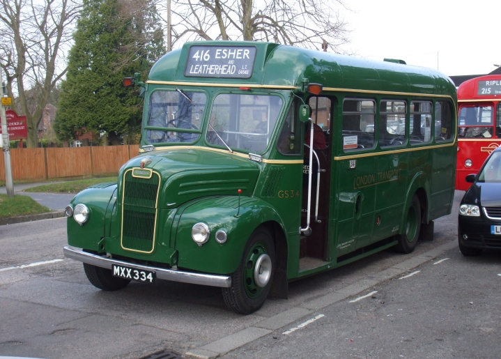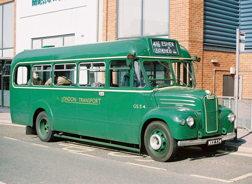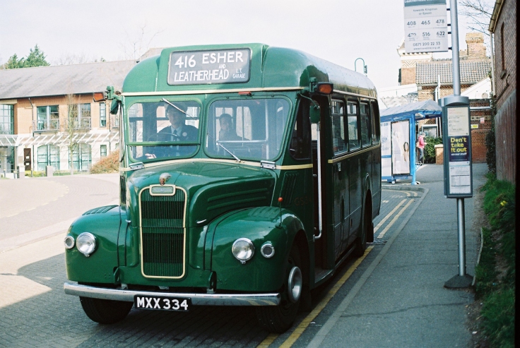 In the woods we came to a roundabout, and turned second left for Tadworth Station. We crossed the railway and turned right down towards the station. There had been speculation on the bus about what might connect with us at Tadworth, but now it was answered: there stood GS34 with 416 blinds ready for the slow trip to Esher.