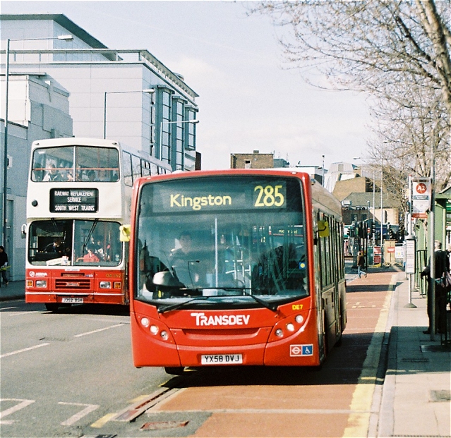 RF534 changed its blinds for a return run to Esher on the 219. A whirring noise and a red blur could be ascribed to Arriva's EnviroDart 3977 heading for Dorking again, with pedal hard to the floor.