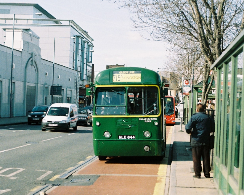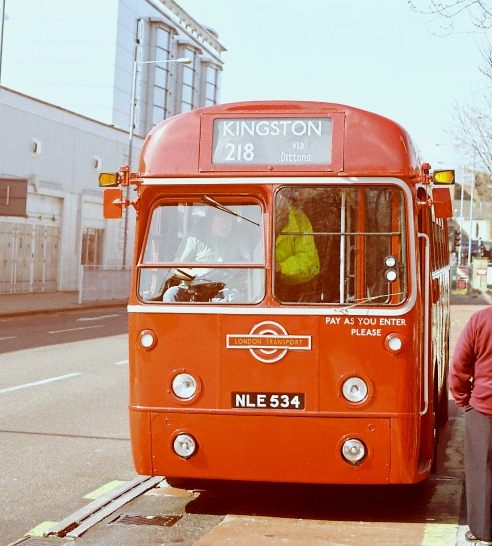 It was strangely nostalgic to be sitting near the back of an RF again. It was the seat behind the wheelarch, with restricted foot-room, that was my usual perch on the 227 going home from school. We rumbled towards Kingston along the Portsmouth Road, passing under the two restrictive railway bridges and running alongside the sparkling Thames. Then we were caught up in Kingston traffic, and picked our way round towards the railway station. We passed the site of the erstwhile Kingston garage, and pulled up on the alighting stop.