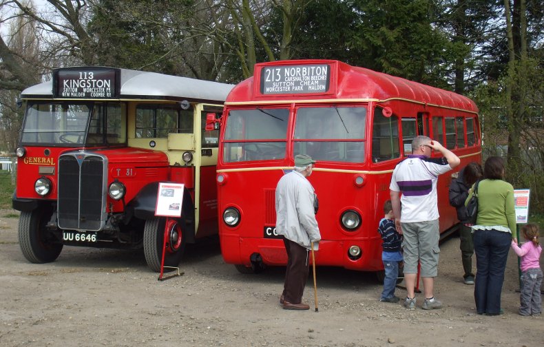 Other single-deckers graced the ends of the paddock too. AEC Regal T31, restored to rear entrance layout, was one of the type long retained in the area to work over Walton Bridge, which at that time was too weak to allow RFs. The side engine, side entrance AEC Qs were also prominent at Kingston, in both green and red liveries. Strange to think that this bus (Q83) dates back to the early 1930s!
