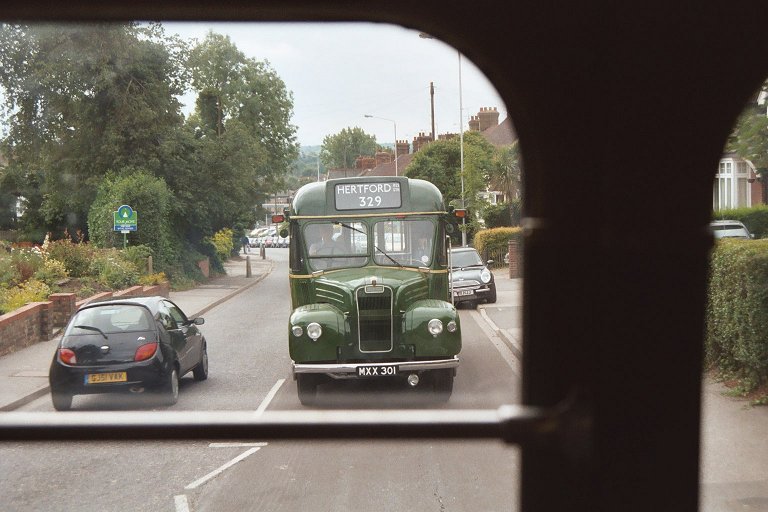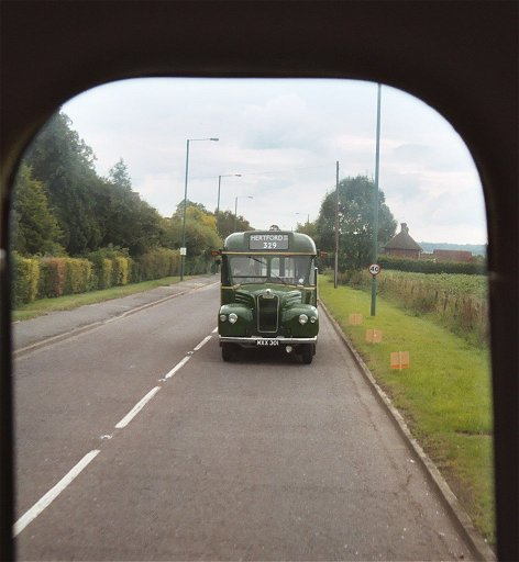 The gathering at the bus-stop boarded RF633, and we headed north, out of Sevenoaks to Dunton Green. GS1 came up behind as we passed the site of the old garage (now a housing development). The GS was still wearing its Hertford blinds as it followed us out into the countryside towards the North Downs and Star Hill.