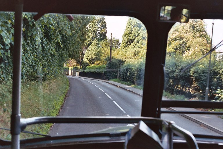 We loaded up, and set off along the road along the top of the North Downs. But there were no views down the escarpment, a quarter-mile to the south of the road. Instead we enjoyed the wonderful scenery of great trees lining the road. We soon passed the Crown, with its primary school, another 471 terminal point, and continued along to Scotts Lodge.