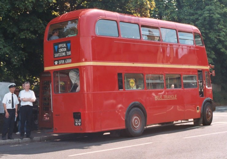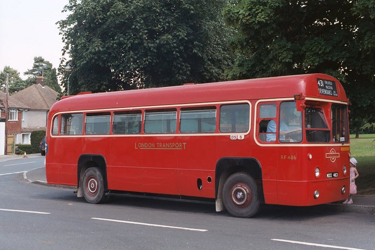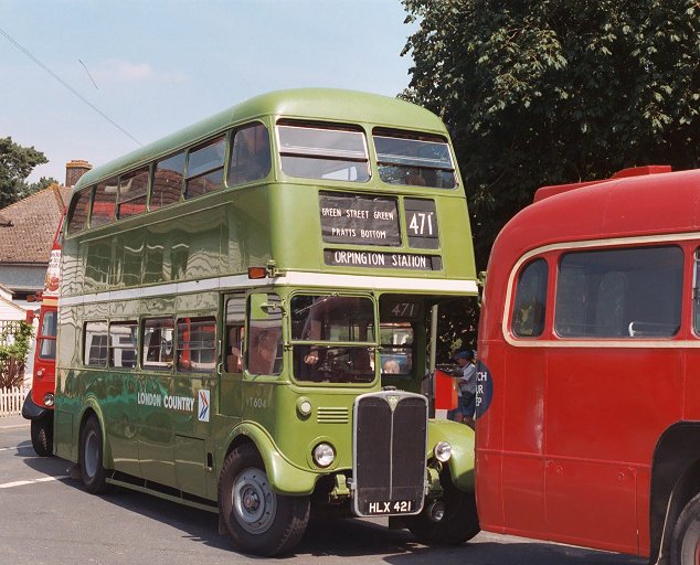 Climbing Rushmore Hill we passed RT2043 heading for Bromley again. We pulled up at The Three Horseshoes, and found another bus jam forming: red RF486 was waiting to depart for Sevenoaks on a 431 (Yes, there was a red RF allocated to Dunton Green for a while). NBC green RT604 pulled up behind ready to work down to Orpington as a 471, with RT1702 on the 47 behind that.
