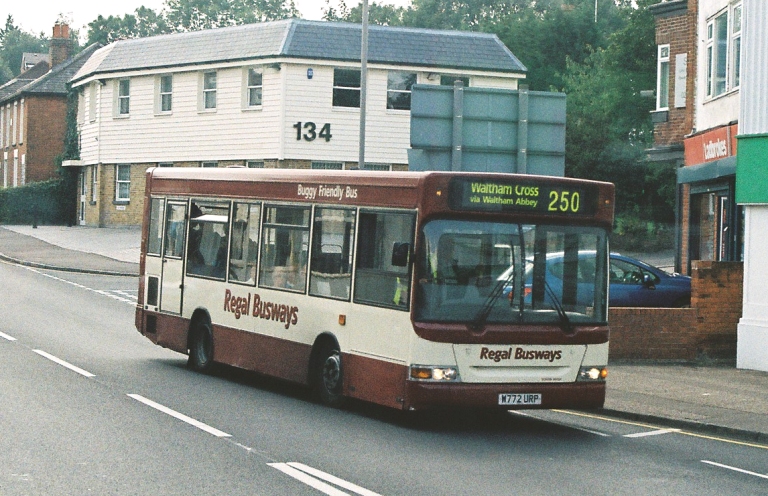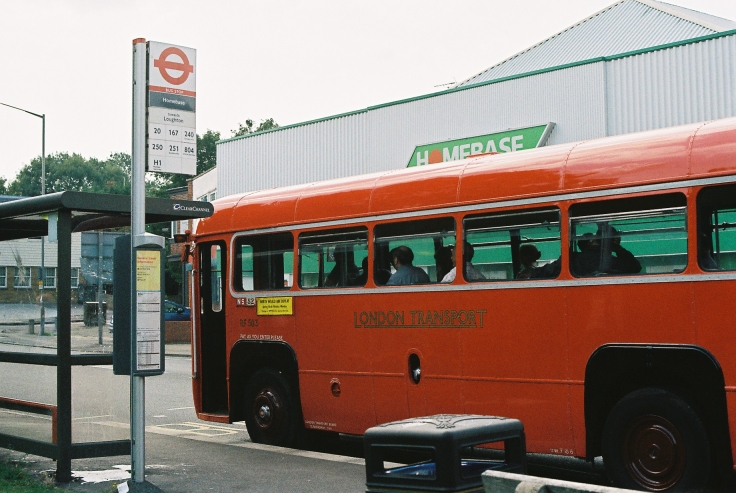 We turned left at The Wake Arms, and rolled down through another mile of forest to the outskirts of Loughton. We passed one of Regal Busways' Darts heading for Waltham Cross on the 250. We couldn't pass Loughton Garage without a pause to survey the scene: on our left the site of the newer garage is now just housing, while across the road the pillars and footings of the older garage survive under the cladding of the Homebase store. The bus stop is prosaically called "Homebase".