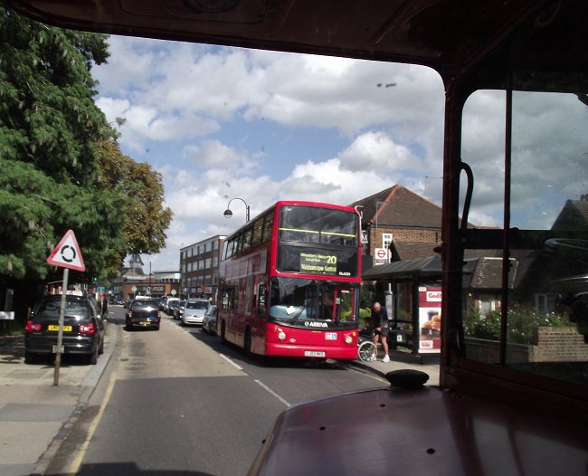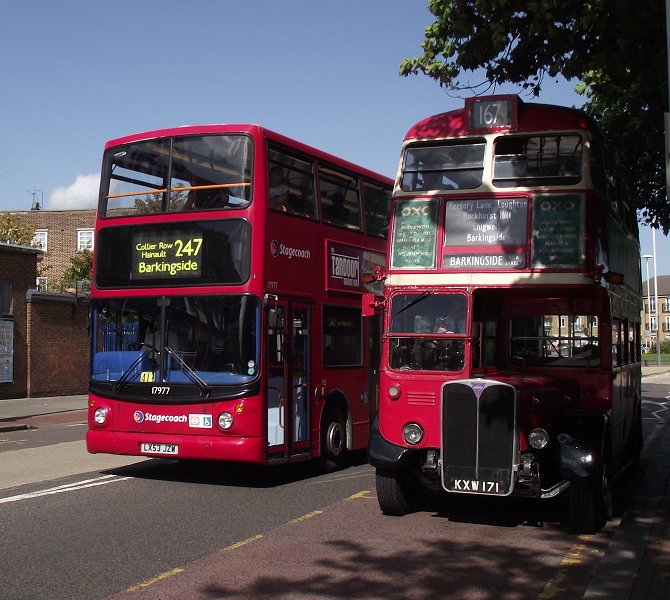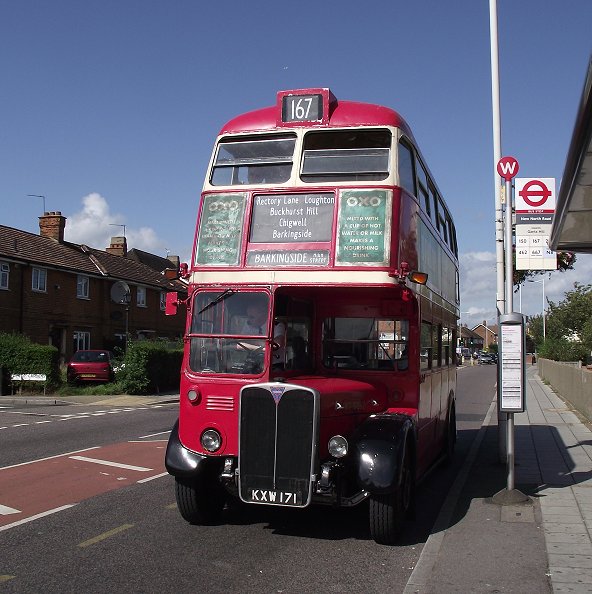 Loughton Classic Bus Running DaySunday 11th September 2011Prepared by Ian Smith, 22nd September 2011167: Loughton Stn to Barkingside: RT3062Now the two double-deckers werev swapping routes: RCL2260 was going to Waltham Abbey, while RT3062 was heading for Barkingside on the 167.I took my seat, and we were away, round in front of the station, up to Loughton High Road, and this time left. The High Road lived up to its name, as we climbed up south-west out of Loughton back into the fringes of the Forest, up onto Buckhurst Hill. We turned left into Palmerston Road, and rolled down towards the Roding Valley, turning in to serve Buckhurst Hill Station. We completed a turn round the little station forecourt, and returned to Palmerston Road. We crossed over Loughton Way into Roding Lane, and descended into the valley. Today, fortunately, it was not clogged with parked cars of Sunday footballers. We climbed the eastern slope, up under the M11 motorway and into Chigwell. We turned right along Chigwell High Road, past the shops then sharp left to reach the Chigwell Station bus-stop. After a pause at Chigwell Station we went on - or tried to. Getting out through the constant stream of traffic on Hainault Road was not easy. We climbed up the hill. At the top there was a surprise view: right across the Thames Valley to the North Downs, and right down the valley to the curling Thames Estuary. We dropped down the other side past Hainault and Fairlop, making a photo stop at The Old Maypole - now known as Stop W: New North Road. While we were there Plaxton-bodied Dart SLF PDL57, of Arriva, came up in service on the 462 to Ilford, then went past. We returned the favour two stops further on, on the approach to Fulwell Cross. Just beyond the roundabout we pulled up at a bus lay-by in Barkingside High Street, outside the library, and stood while photos were taken. Stagecoach Trident 17977, also terminating at Barkingside, off the 247 from Ilford, pulled past us. With a few minutes to go before the return journey, our knowledgeable driver took us round via Baron Gardens into Tanner Lane, onto the official stance, near Barkingside Station. We were joined there by 17977. 167: Barkingside to Loughton Stn: RT3062We set off on the return. Barkingside High Street was busy, and we squeezed along between erratically-driven cars. Alexander-bodied Volvo VLA175 came the other way on a terminating 275, and newer EnviroTrident T188 threaded a path through on a 150 for Becontree Heath.We passed Fulwell Cross and began the long climb up past Fairlop and Hainault. Go-Ahead's MCV Evolution EnviroDart ED23 went past us on the hill, on the service 167 to Debden. Another PDL, 60, came down the hill on the 462 from Hainault to Ilford. We followed ED23 up and over the hill, and down to Chigwell Station. It was still ahead on the way down Chigwell Rise, then stopped at the last stop in Chigwell, before the countryside of the Roding Valley really began. We whooshed past. It caught up again, of course, and squeezed past when RT3062 paused for photos at Buckhurst Hill Station. RT3062 climbed up Buckhurst Hill, to turn north along Loughton High Road, down into Loughton. On the way down we met DLA339 heading for Walthamstow Central on the 20. Back at Loughton Station we found BL49. Could I fit in a trip on it to Epping and back. From the list of extras it appeared that it would fit in after a trip on an RF to South Woodford and back...