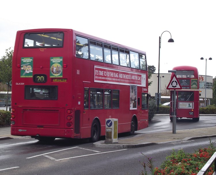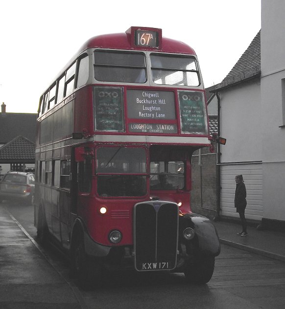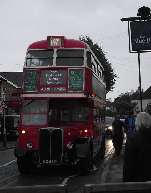 Loughton Classic Bus Running DaySunday 11th September 2011Prepared by Ian Smith, 26th September 2011167A: Loughton Stn to Abridge and back: RT3062At last, at ten to six, RT3062 came off the central stance and went round the bus station to load up for the evening run on the 167A to Abridge. It was pursued up the bus station by departing DLA359 (again) on the 20.We loaded up, and departed, up the bank to Loughton High Road, and left up onto the heights of Buckhurst Hill. We turned downhill towards Buckhurst Hill Station, where we called in for a brief photo-stop. Then it was on down into the Roding Valley, under the M11 and up Chigwell Rise. A right turn took us towards Chigwell Station, where we made a clockwise evolution round the triangle to pull up at the station stop by the shops, pointing north. While we were stopped at Chigwell Station one of the newest buses on the modern 167 route, Blue Triangle's EnviroDart SE30 came past, heading for Loughton and Debden. We then headed north for Abridge, through the rapidly descending dusk. At Abridge we stopped in front of the Blue Boar, and everyone had to alight for the reverse turn manoevre. The bus pulled off the main road, straight ahead into Silver Street, then reversed round the corner beside the Blue Boar into Tree Close under the supervision of our conductor, Peter Larkham. This created considerable interest in the Blue Boar, and even more in the next-door Chinese Restaurant. I climbed back aboard for the ride back past Chigwell Station, Buckhurst Hill Station to Loughton Station. There were photo stops, but I didn't even try under these light conditions. I was tired, and content... Part 6: Garage Run.All photos by Ian Smith. Click on any of them for a larger picture.