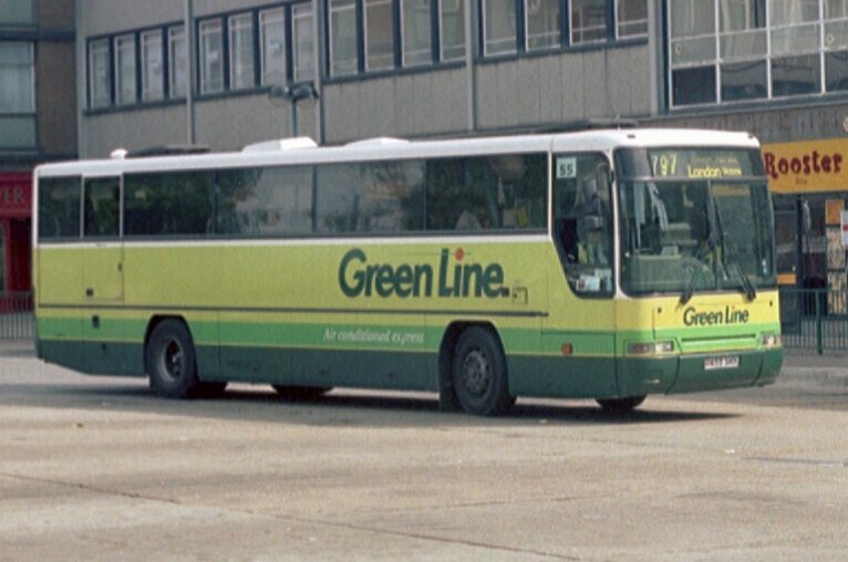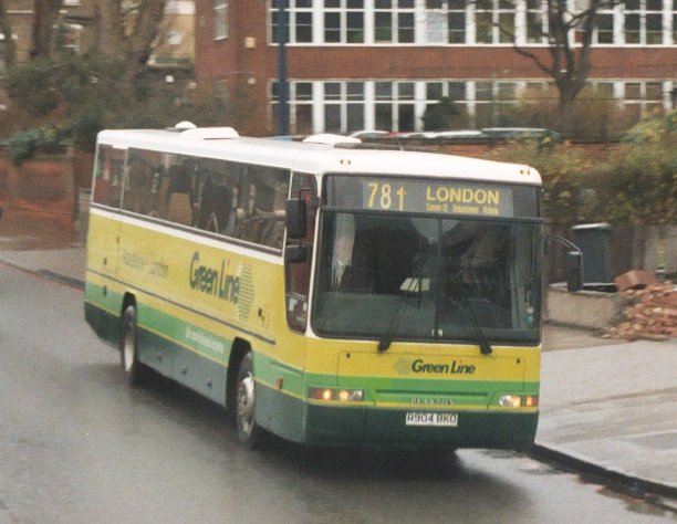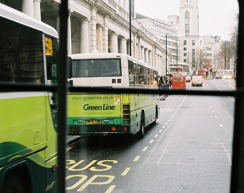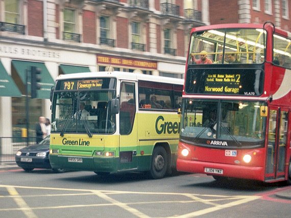 Maidstone & District Plaxtons 2903-2910Despite the Government's interference in the bus and coach industry, making co-operation rather than competition illegal, Green Line managed to survive as a brand name, valued by several different operators of commuter services into London. This was particularly applicable to the Arriva group of companies. These included Maidstone and District, which had made its commuter services from Maidstone part of Green Line Associated Services from 1992, and had adopted Green Line branding in 1995.In January 1998 Arriva Kent & Sussex (the current name for Maidstone & District) took delivery of eight DAF coaches with Plaxton bodywork for use on the Maidstone-London services. They received full Green Line livery and numbers 2903 to 2310. 2904 is seen on its intended duties, the 781 Greenline service from Maidstone to London, passing through New Cross in January 2005. At other times they can be found on Private Hires, such as 2903 passing Sevenoaks Station in July 2004.Commuter's eye view of Greenline 2904, in a traffic jam on the A20 near Mottingham in August 2000. Some of the coaches have moved between the operating companies: 4055/2911 has variously worked Greenline for Arriva The Shires, Arriva Southend and Arriva Kent & Sussex. Here it is on a 797 Stevenage service approaching Victoria in October 2005.In August 2005 The Green Line services, along with the rest of Arriva Southern Counties coaching in the old M& D area, were hived off to New Enterprise. Services 781 and 784 continued to operate from the Maidstone depot. Most of the DAFs transferred to New Enterprise, with the exception of 2909, which transferred to Stevenage for the 797. Those that remained with New Enterprise were repainted into the company's white with red/navy blue ribbons. The "Green Line" services remained with New Enterprise until January 2009, when Chalkwell Services of Sittingbourne provided an alternative commuter service.