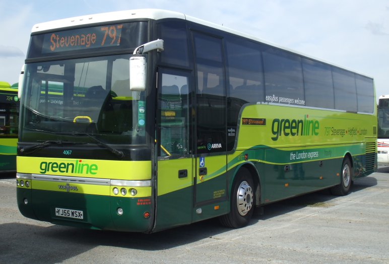 Arriva the Shires Van Hools 4065-4069At the end of 2005 six new Green Lines were received. These had Van Hool bodies with an attempt to cater for the wheelchair mobility market. The coaches retained the high floor needed for the underfloor luggage boot, but had a double front doorway. The second front door opened onto a wheelchair anchorage. This had to be booked in advance: when not booked the space was fitted with four seats. This arrangement resulted in a long front overhang.The batch went into service on the 797 London-Stevenage service. One was damaged in a motorway accident in October 2007 and was impounded by police for two years. 4067 was then rebuilt and returned to service. Another Van Hool, given temporary fleet number 0412, was hired by Arriva for most of 2008. 4066 was at Cobham Museum's pre-hibernation day celebration of Green Line in October 2008.Rebuilt 4067 joined other Green Line coaches at Wisley Airfield for Cobham's celebration of 80 years of Green Line in April 2010. The long front overhang and double front doorway are apparent.