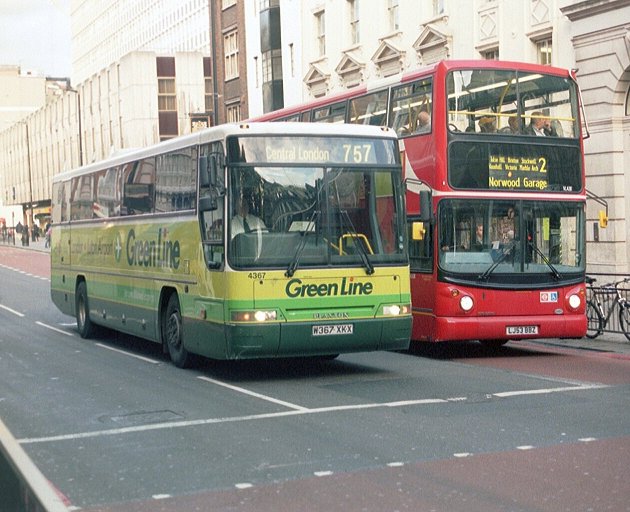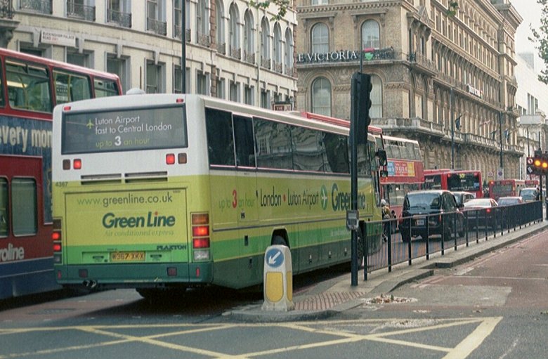 Arriva the Shires Plaxtons 4359, 4361-4369Another batch of ten Plaxton Premiere 320-bodied DAFs was bought by Arriva the Shires in July 2000. These went into service on the 757, replacing earlier similar Plaxtons.Arriva the Shires' 4367 passes Victoria Station on 757 in October 2005 on a Luton Airport 757 service.Arriva took on responsibility for the Easyjet connection between Luton Airport and London, and in mid-2005 made a deal to offer a guaranteed proportion of seats on the 757 to Easyjet passengers at discounted fares. In conjunction with this 4361/3/5 were repainted in Easybus orange livery with prominent branding.4366 went for scrap in 2006, after hitting a motorway gantry support in an horrific accident. The batch stayed on the front line until the spring of 2009, when they were cascaded to Hemel Hempstead or Stevenage by the arrival of the six-wheeler Acrons. A variety of liveries appeared now, with the Easybus liveries disappearing from this batch. 4361 and 4365 went back into new bow-wave Green Line livery, along with 4359, 4367 and 4369; 4362, 4363 and 4368 went into schoolbus yellow; 4367 then was repainted again into interurban blue/blue.cream horn. 2011 saw four of the batch go into white with blue skirts for dual purpose training and/or railway replacement.