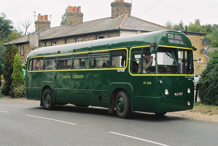 I climbed aboard to talk to the crew. I noted the unusual interior: although RF308 is restored as a London Country bus, it had much earlier been a bus, and then converted to a GreenLine coach, so had conversion pattern luggage racks and a seat layout unique to the conversions.