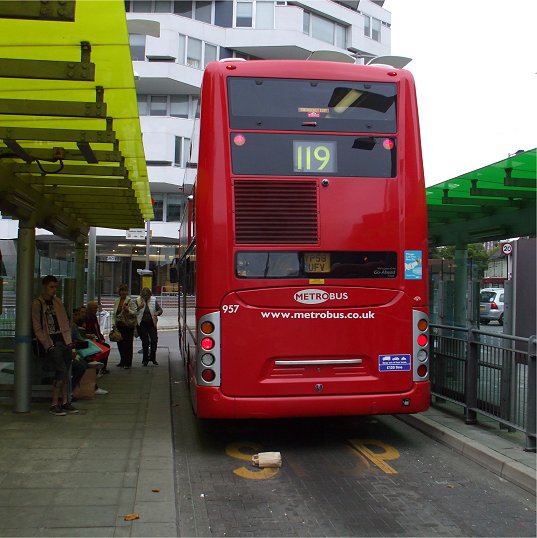 I headed for West Croydon on foot. Buses passed as I went, including one of the new Scania OmniCitys with Polish double-deck bodywork, Metrobus' 955 on route 405 from Redhill. (I fluffed the shot of ITS new-style rear end, so here's one I took the day before of 957 on the 119 at East Croydon.)