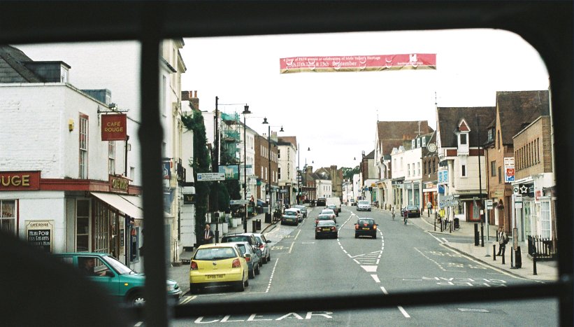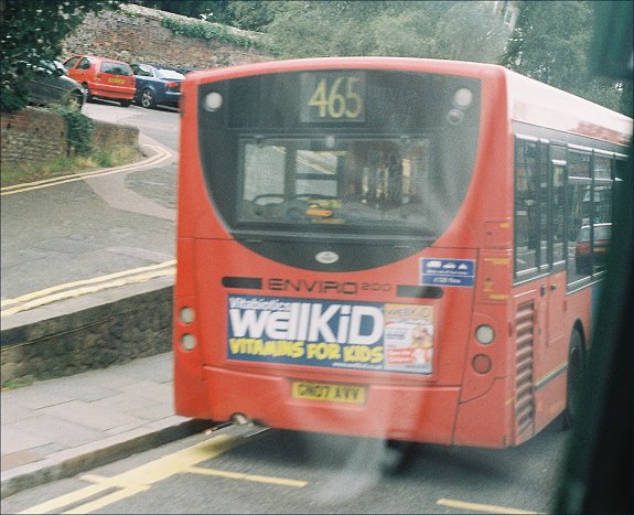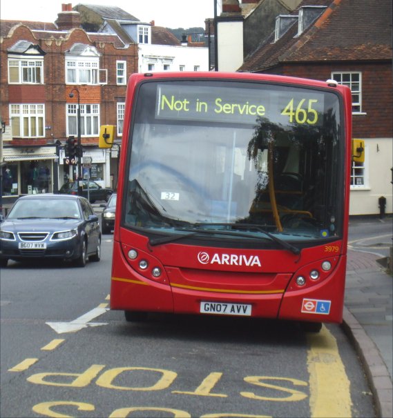 Then it was on down the hill to Burford Bridge, where we rejoined the A24 at the roundabout. We swept south past Dorking North Station, and turned right by the stainless steel cockerel to run into Dorking. It seemed strange to be running straight past Dorking Halls without turning in. We headed up the broad High Street, following the one-way flow into narrower South Street. Arriva's Dart/Enviro200 3979 was standing at the stop, presumably waiting to return north on the 465.