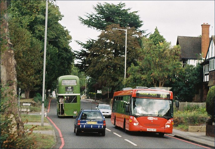 We met OmniCity 562 on the 293 at the White Horse, and rumbled on through Epsom. On the way through Ewell we caught sight of RT604 ahead, and met OmniCity 566 on the westbound X26.