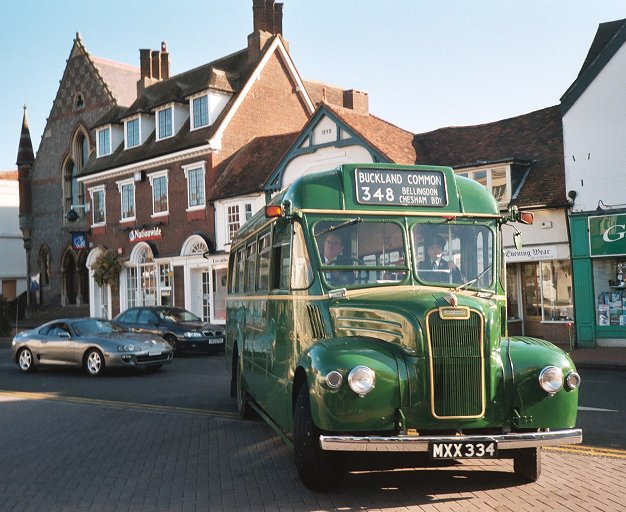 A short way down the M40 we turned off into Beaconsfield, and stopped between the Saracens Head and the church, the old GS terminus. Alan put up several blinds of Beaconsfield routes: the 398 and 373, then turned the bus ready for the drive to Amersham and Chesham. We set off along the 398 route, but did not make the diversion off the main road, to Coleshill, as we had the awning and stall to put up at Chesham before the others arrived. But we did pause at Amersham station, where the blinds were changed to 397 for the run into Chesham. We spread the word to some enquirers too, and picked up some early passengers to Chesham.