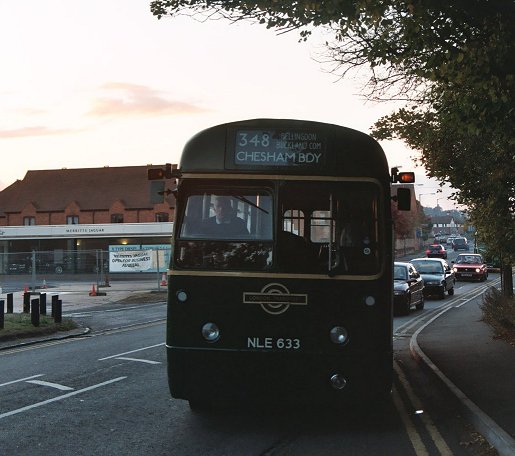 Packing up complete, the four buses for Surrey and Sussex loaded their passengers and set off in the gathering twilight. GS62 led the way, with the intention that we should stop together at a garage on the A413 just beyond Amersham. It was closed. Demolished. Gone. GS62 pulled into a layby to let traffic pass and to let RF633 come up behind, and non-driving crew exchanged phone messages. We drove on along the Uxbridge road, and I proved to myself that photography from a moving bus in these light conditions isn't feasible.