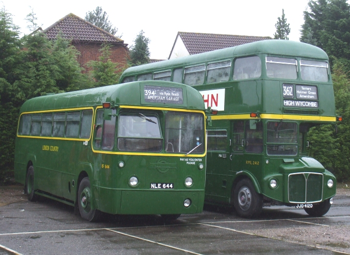 In the bus park two buses stood side by side in London Country green and yellow: RF644, with the reduced-aperture blinds of the period, when RFs could be scheduled to undertake almost any Country service. In this case it was set up for the 394C. RML2412 was the other in London Country livery, blinded for the 362 to High Wycombe.