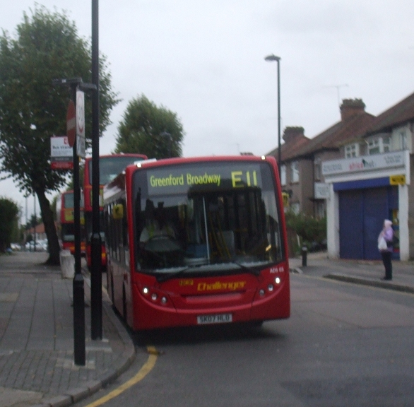 A wiggle took us south through Greenford, where NCP's Enviro200 Dart ADS03 was lurking on the E11 in the gloaming,