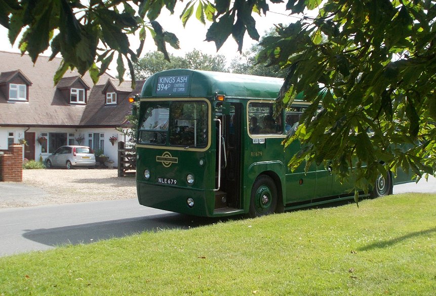 Chesham Broadway Micro Running DaySunday 2nd August 2015Prepared by Ian Smith, 12th August 2015.394D: Chesham Broadway to Kings Ash: RF679The Metropolitan Line delivered me to Chesham from Baker Street on Sunday morning. A small band of enthusiasts walked down to Chesham Broadway, where we found RF679, plus Carousel's Solo 712 ready for route 1 to High Wycombe.RF679 was set up for the 394D to Kings Ash, a terminus that had not been visited for 57 years! The family that owned the driveway that we would use to reverse had come down to ride on the bus. The other bus on the 394/394D set of routes was T792, which arrive and sat on the other side of the Broadway. There was no sign of the two GS buses for the 348 set of routes, nor the Routemaster that was substituting for RT3148. It seemed that our mini running day was turning into a micro one. (It turned out that the RM was stuck on a Thames bridge in London, not allowed by the Police to continue or reverse, courtesy of the bicycle event that clogged up the Capital for the day. One of the GSs had broken down on the way, and we knew not what happened with the other.) Then came a surprise. Ex-Autocar Dart Marshall M513VJO turned up. This bus had started as Oxford 513, but had latterly been with Autocar. It even operated into the old London Country area on the 210 from Tonbridge to Ide Hill and Brasted. Now it is in preservation, wearing Autocar livery. RF679 set off for the journey to Kings Ash. From The Broadway we headed across the roundabout and up the long hill towards Chartridge. Once up the long steep grind we motored along the ridge, then made a photo-stop in Chartridge. Another followed a little further on, at Cherry Tree Farm, where we paused by an extant LT bus stop. This had survived in situ because it is mounted on a telegraph pole. BT had requested that such flags be left in place, rather than substituted by a simple sheet metal modern sign, for the sake of engineers who work up such poles. Much nicer to land on if you slip! But unusually this request stop has not been painted over nor covered in a vinyl sign. We continued on, then turned left down Ballinger Lane towards Lee Common. Narrow. We reached the village and turned right into Oxford Street. We pottered along the village street, and turned left at the end, where Lee Clump Road took us down to The Lee. The Lee is pretty. This time we were just passing through, enjoying the flowers! We paused by the apple tree on the green for a moment. Then we were back into the greenery, winding a way towards Swan Bottom Crossroads, where we turned left towards Kings Ash. We passed a scatter of houses and cottages along Chesham Lane. Then the houses came more rarely, and the lane narrowed. Then we were there. The terminus at Kings Ash was just a driveway between two houses. Turning the 30-foot RF was not easy. How they managed in the dark, in the final OMO days of the terminus, I know not. Anyway, we made the turn, and stood a little while in the end of the driveway for the blinds to be changed.