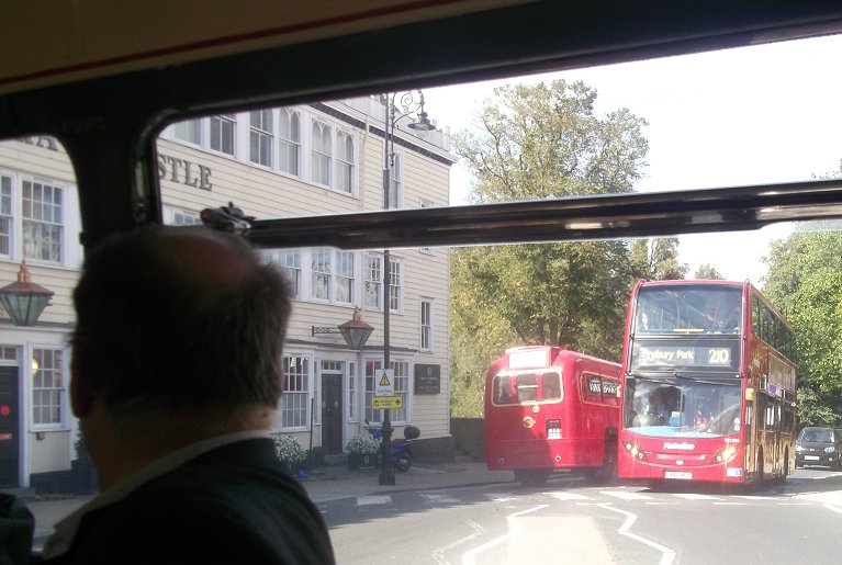 Route 210: Sixty years from first RFsTuesday 11th September 2012Prepared by Ian Smith, 14th September 2012.210: The Spaniards to Golders Green and back: RF433, RF395RF395 pulled away, and was quickly followed by RF433. I climbed aboard. At Jack Straws Castle we almost caught up with RF395, as it turned the corner past TE1086. We followed behind down to Golders Green, where I crossed the road in time to catch RF395 making its immediate return.I alighted at the stop on the approach to the Toll House from the west. TD95 was already resting there. EnviroTrident TE1091 pulled past on a service bus, followed shortly afterwards by RF395.