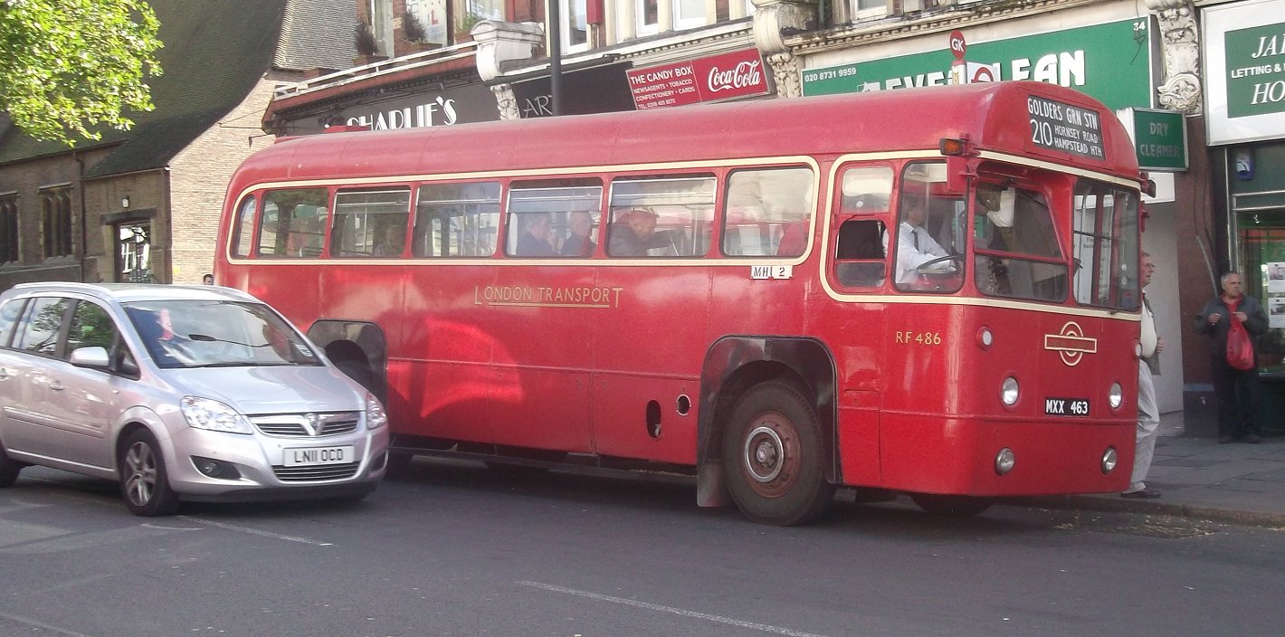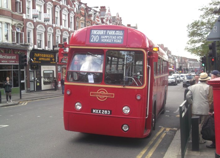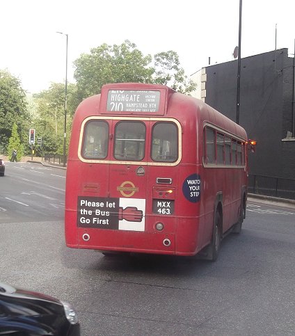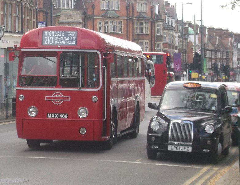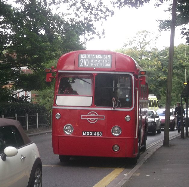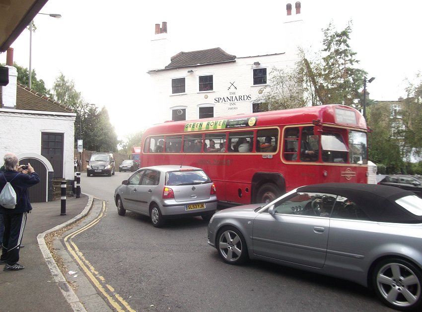 210: The Spaniards to Golders Green: RF491By now the afternoon traffic through the Toll Gate was building up, with bad temper and displays of stupidity by many car drivers. I watched RF433 squeeze through, heading for Finsbury Park, then went to join RF491, which had rolled up in the queue from the east.RF491, the Timebus RF, took me westwards to Jack Straws Castle, and down the hill to Golders Green, where I alighted to wait for the following (last) RF. I crossed the road, and watched RF491 make a circuit of the roundabout and return past the taxi rank to load up for its last journey of the day, to Archway Station. Cadet 3721 went the other way on the 168.