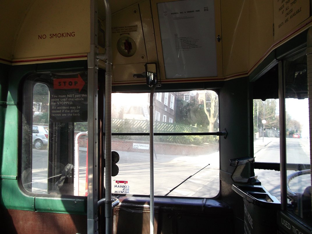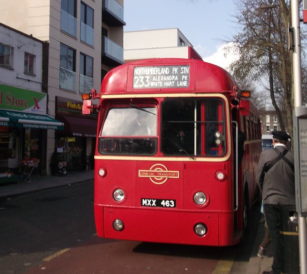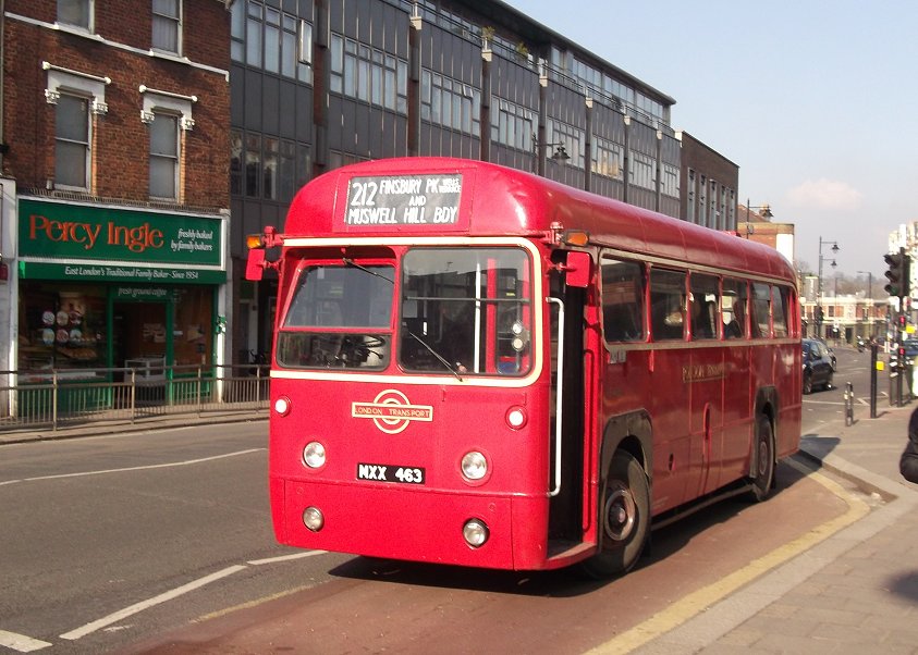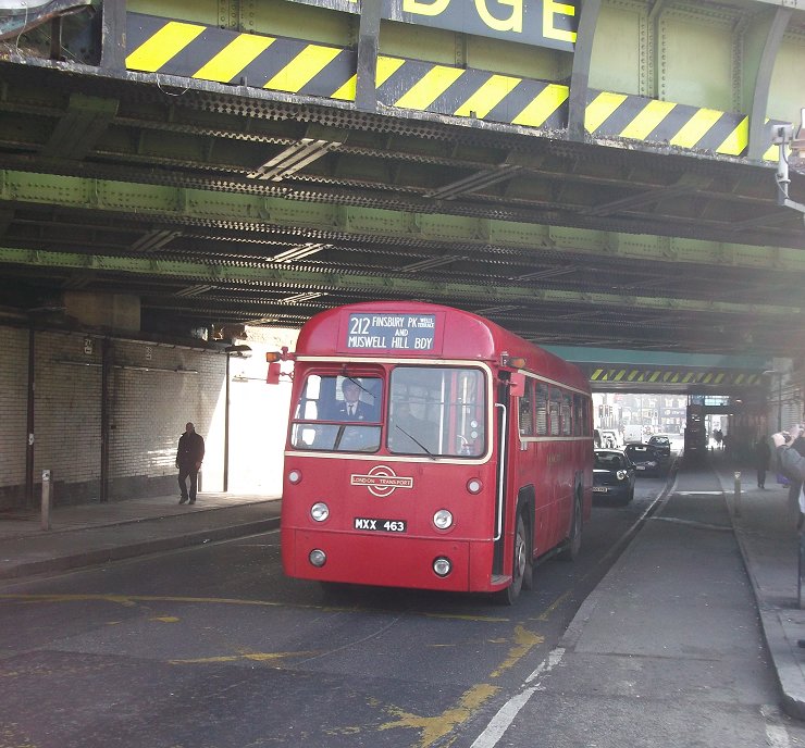 Routes 212 and 233 Revisited by RFSunday 17th February 2013Prepared by Ian Smith, 21st February 2013.212: Finsbury Park to Muswell Hill Broadway: RF486The crowd gathering at the corner of the bus station increased. Once it exceeded thirty it seemed unlikely that we would all get on the Rf when it arrived. A red single-decker came under the railway bridges - it was a Dial-a-Ride Tucana, D7157. Not as stylish as a GS of similar size.A few minutes later RF486 came the same way, under the low bridges, and went round the block to pull up at stop A in the bus station. The scrum round the door reminded me strongly of the schoolboy crowd trying to board the 227 at the grammar school stop in Penge High Street. Not nice. I was towards the back, and wondered if I would make it. I did, just. There was a seat at the back, next to the daughter of the man who boarded behind me. I let him have it. Where was I going to sit? Nigel Henty shifted up on the offside longitudinal 4-seater, and I squeezed in beside him. A lady who just hadn't made the cut was giving our conductor Steve Whitelegg an earful at the doorway. Did she realise that it just through the efforts and expense of him and Peter Osborn that this trip happened at all? Eventually she wound down and let go, whereupon we could draw away, round onto Stroud Green Road. We headed north. The view from the long seat was not as good as from the front upstairs seat on the VW. No trains at Crouch Hill Station. We climbed the hill and crossed the disused railway, now the Highgate - Finsbury Park Walkway. Over the hump, we dropped down to the road junctions in Crouch End, passed the clocktower and forked left past the clock-tower onto Park Road. On the way we discussed various things: How much heavier is a full load now than in 1952? Was the replacement of two nearside seats with a luggage rack to compensate for the weight of the doors and their mechanism? Was the fare chart the smallest we had seen? Our discussion about weight were emphasised on the climb up Muswell Hill in the red bus lane: the extra half-ton of human flesh, making the all-up weight in excess of eleven tons, really told as we went down the gears on the final climb to reach the terminus. Most people alighted to take photos. Peter parked RF486 in the central bus stance.