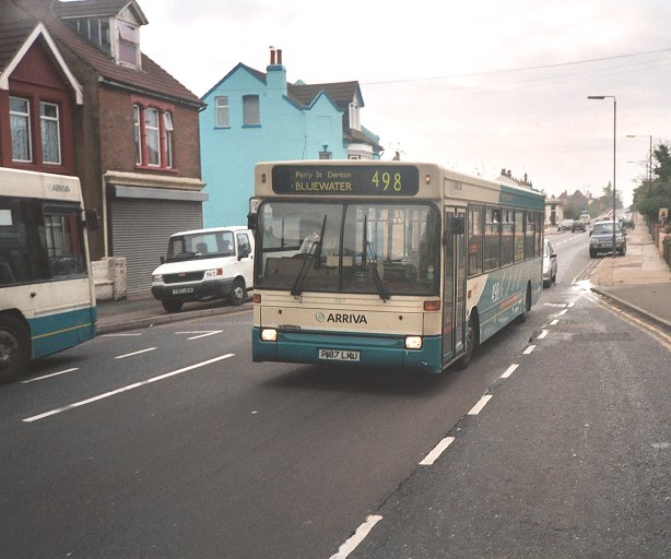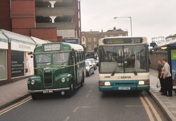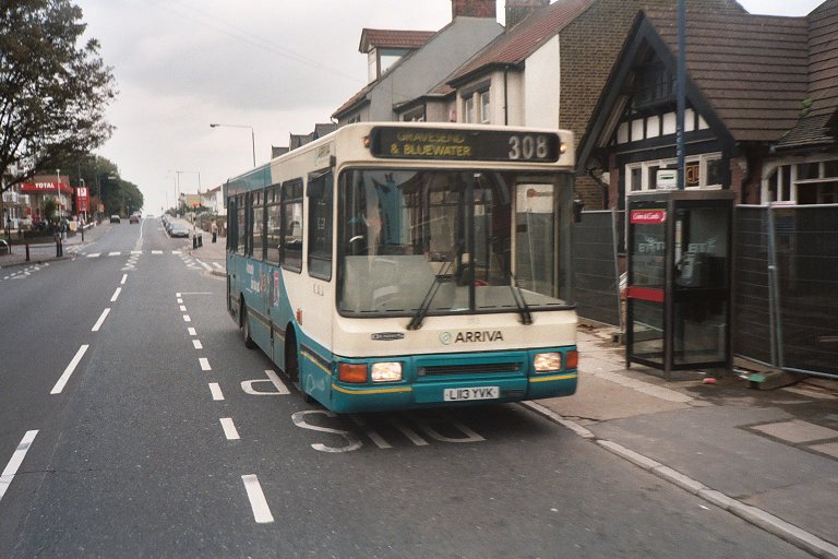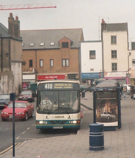 GS62 followed us out of Parrock Street carpark. Alan Charman was operating a magical mystery tour extra, and as he followed us down towards the Clocktower he treated us to a splendid display of various Northfleet and Swanley-area blinds. As we approached the station RM8 swept round from Parrock Street. We went on past Gravesend Station, where we went round Arriva 3113, one of Arriva Kent Thameside's Darts with Northern Counties bodywork, which was operating on the 308.