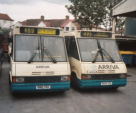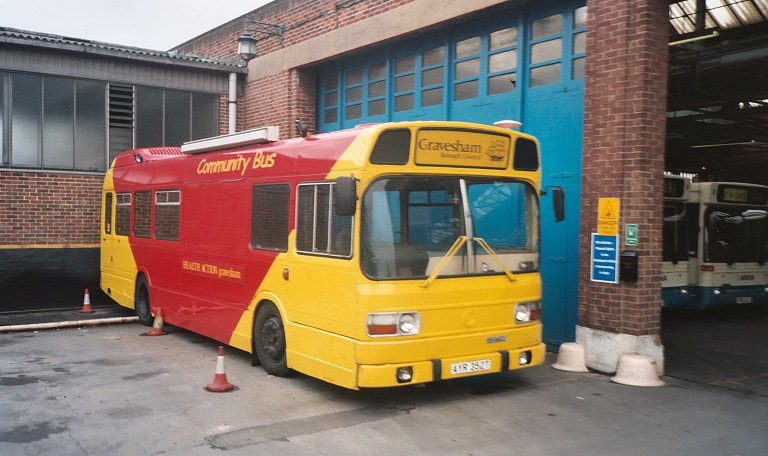 We continued along to Northfleet garage, and pulled in. Although the restrictions on alighting still applied, the platform of the RT made a reasonable -if moving - viewpoint for observing the Sunday line-up. A bunch of six-year old MetroRiders, including 1809 and 1810, were on the left at the foot of the entrance ramp. Gravesham Borough Council's Community Bus, once LT's LS352, stood outside the garage doorway. Plaxton-bodied Darts were lined up inside, but the RT did not enter, just pirouetting in the yard.