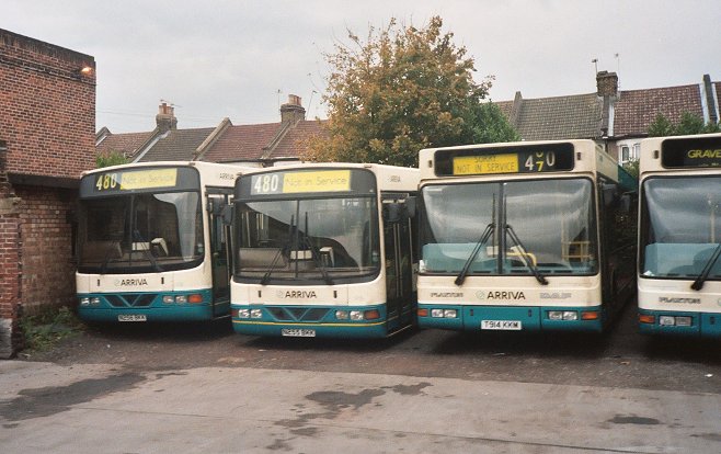 Wright-bodied Scanias 3256 and 3255 represented the 480 contingent (others being out on service). 3914, 3913, 3916 and 3921 were more than half of the fleet of Plaxton Prestige bodied DAF SB220s, apparently used on 470, 480 and 490. Lynx 3051 was still in the line-up, as was 7616, last of Northfleet's Volvo Citybuses with East Lancs body. Two more of the Northern Counties-bodied Darts lurked in the corner, together with one of the East Lancs-bodied Darts acquired from Guildford & West Surrey.