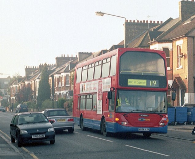 I walked into Bromley along Burnt Ash Lane. At the Park Lane stop stood a Metrobus Dennis Trident with its emergency flashers winking away. I didn't enquire what the problem was with 424, but the stationary bus at the stop reminded me of my first good look at a STL tree-lopper, parked on this very spot many years ago. Not that there were any houses on the bus-stop side then - this was the vicarage garden. Anyway, I strolled on. A bit further on towards Bromley North past Farwig Lane (consistently altered even forty years ago to Earwig Lane by graffiti afficionados) I met Omnidekka 496 bustling along wearing inappropriate 119 blinds. Presumably this was on the way to take over the 261 turn from 424 - or was it just conveying a fitter?