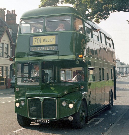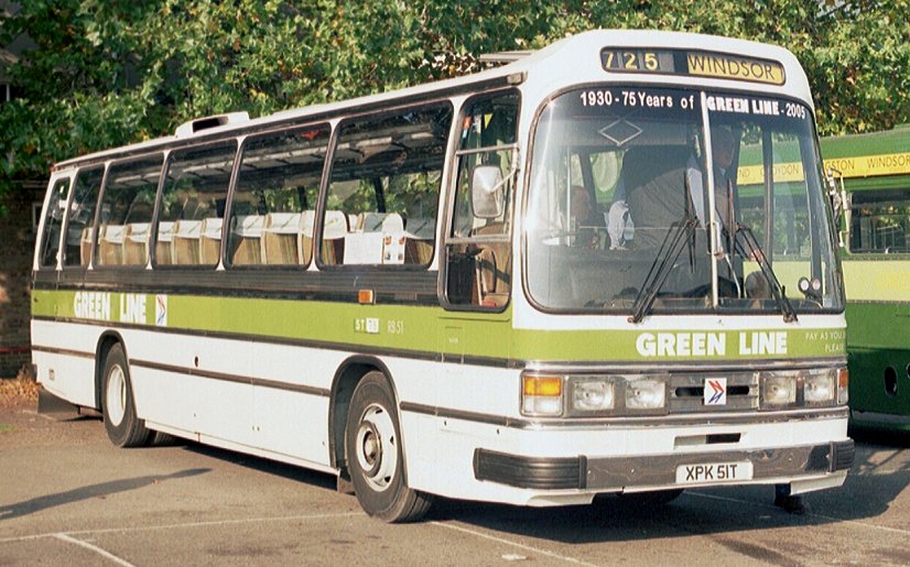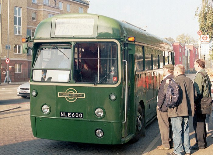Green Line AEC Reliance RB51 showed how GreenLine made a serious attempt to upgrade its image after the serious loss of traffic in its Leyland National days, and was dressed for forays on the 725. Next to it RF281 showed how London Transport had risen to the challenge of the unreliability of an earlier generation of Reliances by modernising its fleet of RFs with new liveries, go-faster trims, dual headlights and new interior decor.